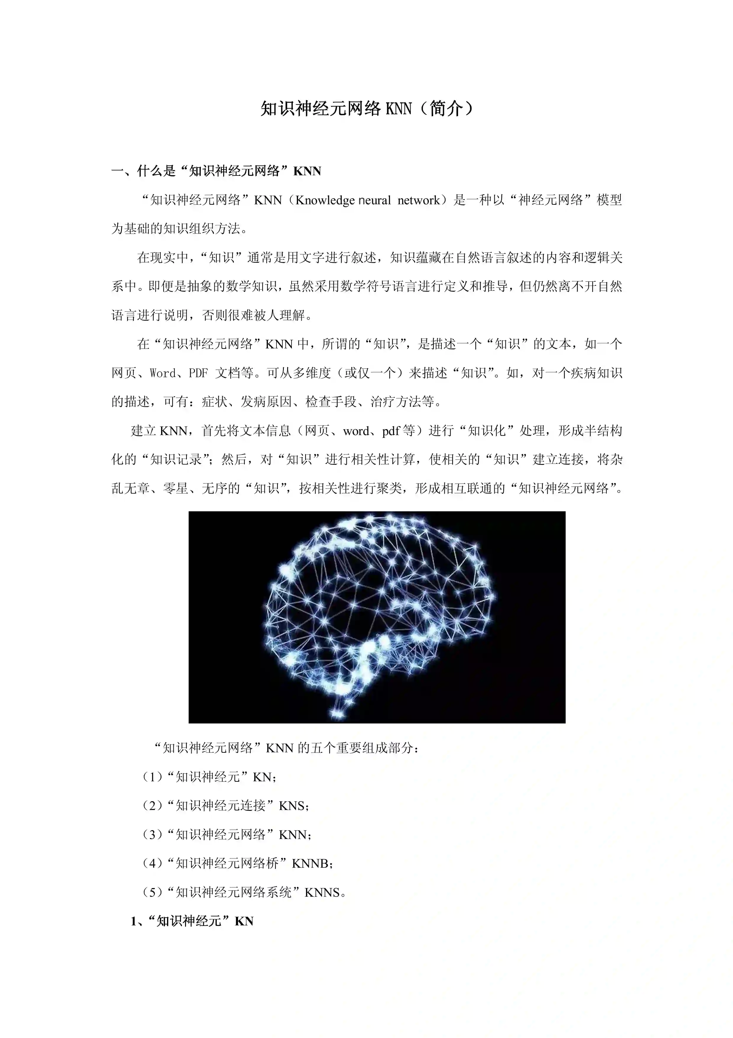 简介: “知识神经元网络”KNN(Knowledge neural network)是一种以“神经元网络”模型 为基础的知识组织方法。在现实中,“知识”通常是用文字进行叙述,知识蕴藏在自然语言叙述的内容和逻辑关系中。即便是抽象的数学知识,虽然采用数学符号语言进行定义和推导,但仍然离不开自然语言进行说明,否则很难被人理解。 在“知识神经元网络”KNN 中,所谓的“知识”,是描述一个“知识”的文本,如一个网页、Word、PDF 文档等。可从多维度(或仅一个)来描述“知识”。如,对一个疾病知识的描述,可有:症状、发病原因、检查手段、治疗方法等。 建立 KNN,首先将文本信息(网页、word、pdf 等)进行“知识化”处理,形成半结构化的“知识记录” ;然后,对“知识”进行相关性计算,使相关的“知识”建立连接,将杂乱无章、零星、无序的“知识” ,按相关性进行聚类,形成相互联通的“知识神经元网络”。