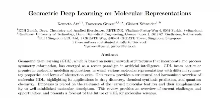 几何深度学习(GDL)是一种基于神经网络架构的学习方法,它可以整合并处理对称信息。GDL在分子建模应用中有着特殊的应用前景,在这些应用中存在着具有不同对称性和抽象层次的各种分子表示。本文综述了分子GDL在药物发现、化学合成预测和量子化学中的应用。重点放在学习的分子特征的相关性和它们的互补的完善的分子描述符。本文综述了当前的挑战和机遇,并对GDL在分子科学中的应用前景进行了展望。
