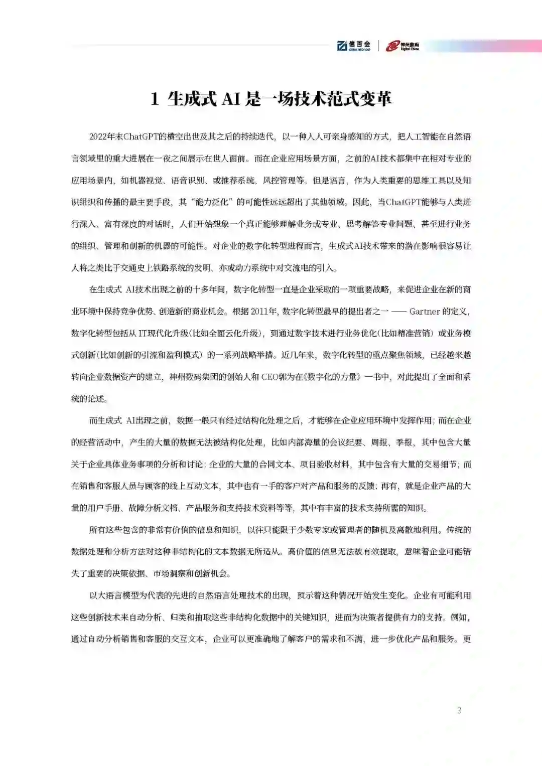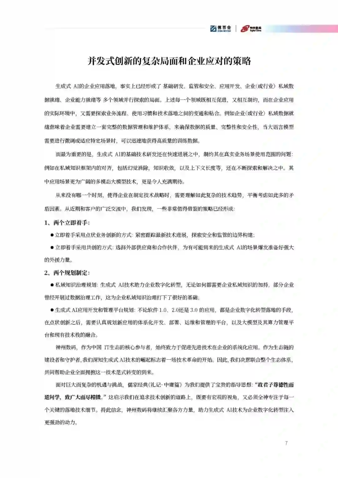 围绕促进我国AI产业发展,白皮书还提出了要注重优化和完善AI产业生态、积极推动AI落地应用、坚持AI关键核心技术领先发展和完善数据治理体系等四方面的对策建议。 虽然生成式AI所引发的技术变革和应用场景的爆发还处于早期阶段,但企业数字化转型中应用生成式AI已经成为一个不可逆转的趋势。作为中国IT生态的核心参与者,神州数码始终致力于促进先进技术在企业的系统化应用,助力企业更好地实现数字化转型,把握生成式AI技术带来的无限机遇,同时也希望这份《白皮书》能够起到“抛砖引玉”的作用,为业界提供有价值的启示和启示。