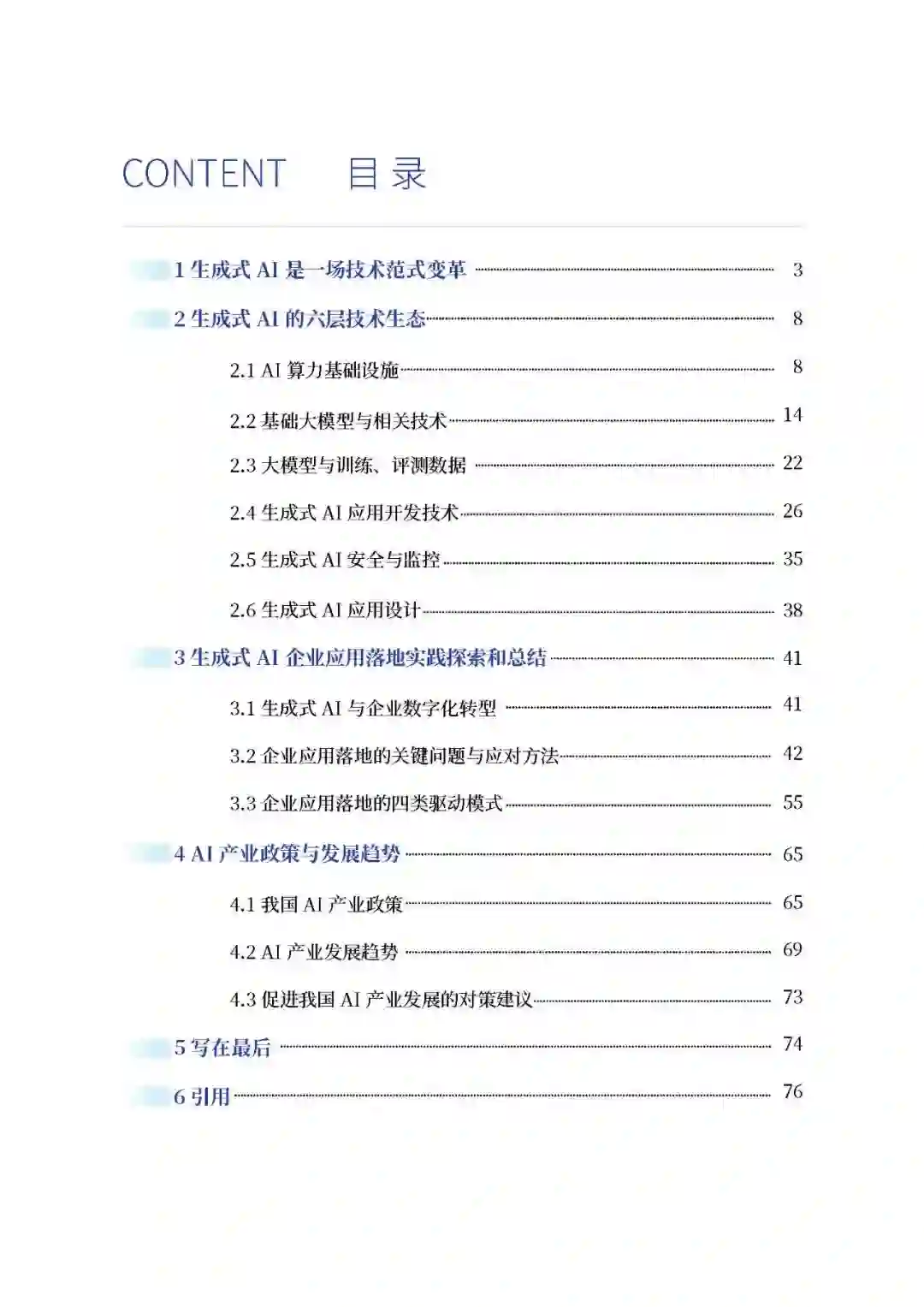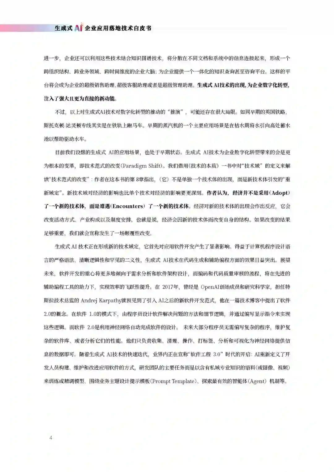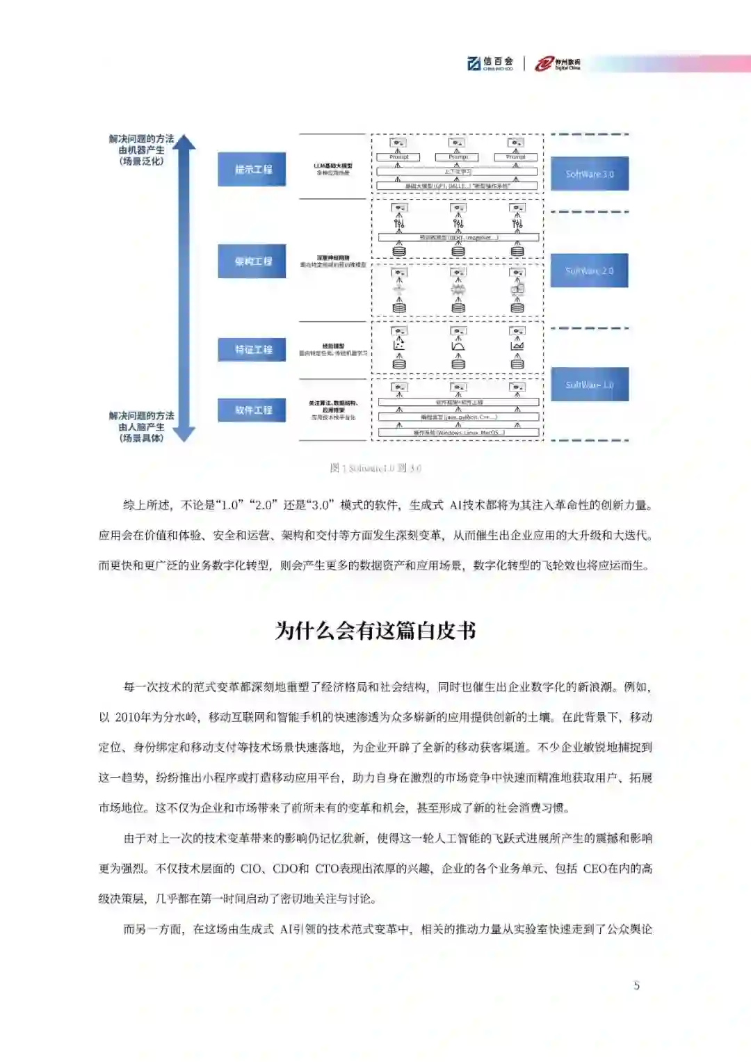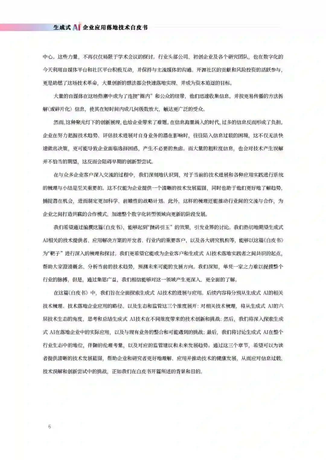 近两年来,生成式AI的出现,开启了一场盛大的科技革命,并点燃了新一轮企业数字化创新的热情。但社会各界在创新研究过程中,产生的海量碎片化信息所形成的信息过载,致使企业在把握技术前景时往往面临选择困惑或不必要的焦虑。 **《白皮书》基于充分的行业洞察,明晰了生成式AI生态框架中的一些关键技术及概念。**经观察梳理,《白皮书》认为,目前生成式AI相关技术已形成六层架构生态体系,包括AI算力基础设施、基础大模型与相关技术、大模型与训练及评测数据、生成式 AI应用开发技术、生成式 AI安全与监控以及生成式 AI应用设计,系统总结了生成式AI技术生态架构,为企业深入了解生成式AI技术框架体系提供强而有力的理论参考。
