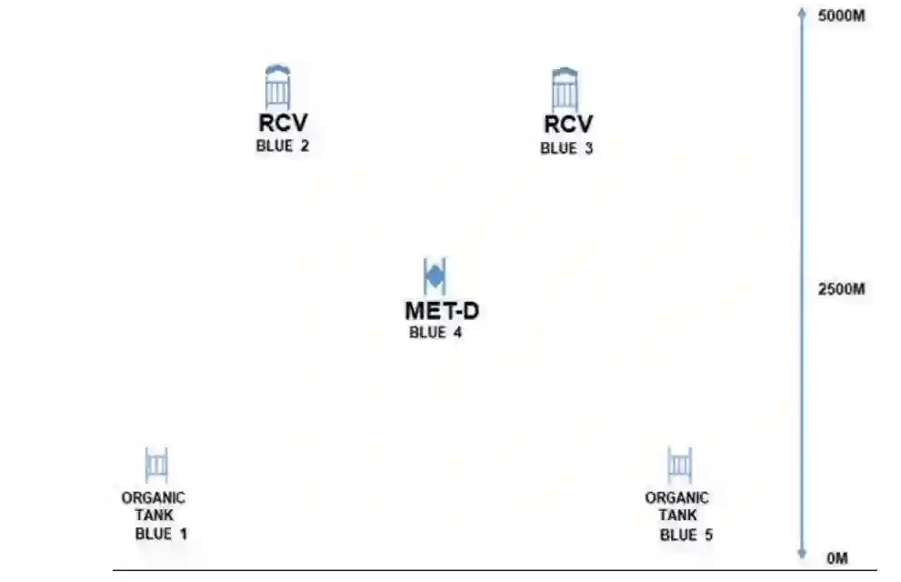 图 2. PC22 行动图,描述 NTC “盒子 ”中的 FLoT、机器人和传感器。(第 1 骑兵师 1-7 骑兵团 CPT Max Laguna 绘制)。