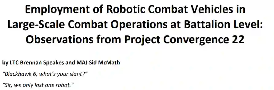 总之,事实证明,在调整战场框架以考虑联合兵种层级的同时,将 RCV 作为联合兵种团队中的另一种工具时,RCV 的使用效果最佳。这些简单的改变使中队能够更容易地识别和摧毁敌人阵地,同时保护 RCV,最重要的是保护士兵的生命。