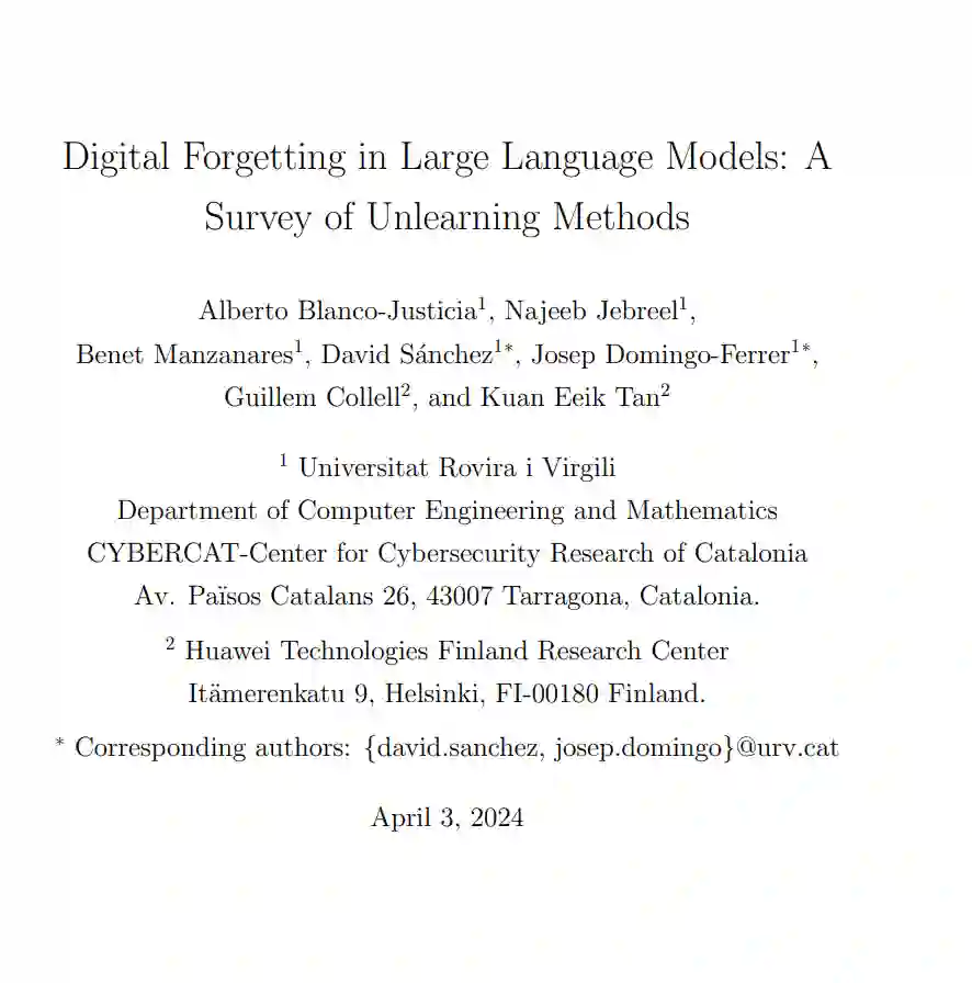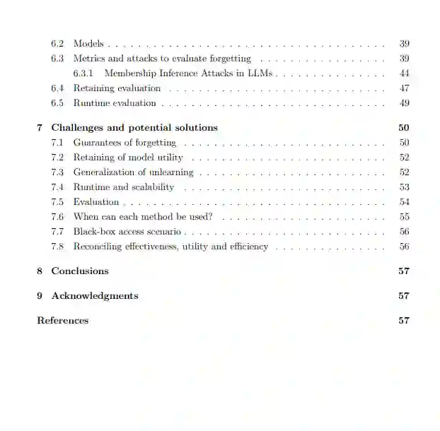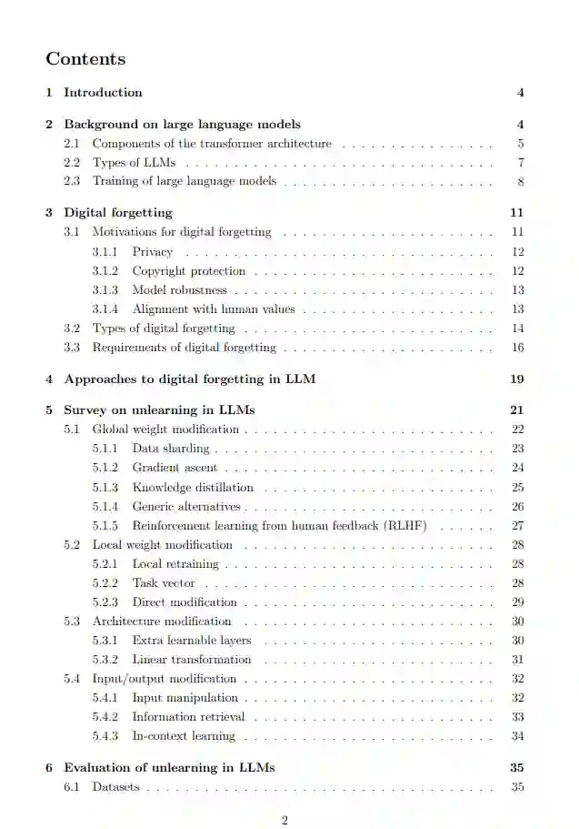 大型语言模型已成为自然语言处理(NLP)和自然语言理解(NLU)任务中的最新技术水平。自从Vaswani等人在2017年发布变压器(Transformer)架构以来,多位作者已经利用这一架构或其变体来处理翻译、摘要、问答、情感分析或文本生成等任务。自OpenAI在2022年11月宣布并发布ChatGPT以来,该技术将大型语言模型(LLMs)的能力带给了广泛的用户群体,引发了几个主要问题,主要关注这些模型与社会价值和法律规则的一致性。这些关注点包括这些模型对劳动市场的影响、对个人隐私权的影响、对版权法的影响、对偏见和歧视的进一步推动,以及生成可能用于伤害人们的有害内容的潜力。解决这些问题的一个提议是数字遗忘。数字遗忘的目标是,给定一个具有不希望知识或行为的模型,获得一个不再出现检测到的问题的新模型。然而,有效的数字遗忘机制必须满足可能冲突的要求:遗忘的有效性,即新模型遗忘不希望的知识/行为的程度(通过正式保证或通过实证评估);模型在期望任务上的保留性能;以及遗忘程序的及时性和可扩展性。 本文档的结构如下。第2节提供了LLMs的背景,包括它们的组成部分、LLMs的类型及其通常的训练流程。第3节描述了数字遗忘的动机、类型和期望属性。第4节介绍了LLMs中数字遗忘的方法,其中遗忘方法学作为最新技术而脱颖而出。第5节提供了LLMs机器遗忘方法的详细分类,并综述和比较了当前的方法。第6节详细介绍了用于评估遗忘、保留和运行时间的数据集、模型和指标。第7节讨论了该领域的挑战。最后,在第8节中我们提供了一些结论性的评论。