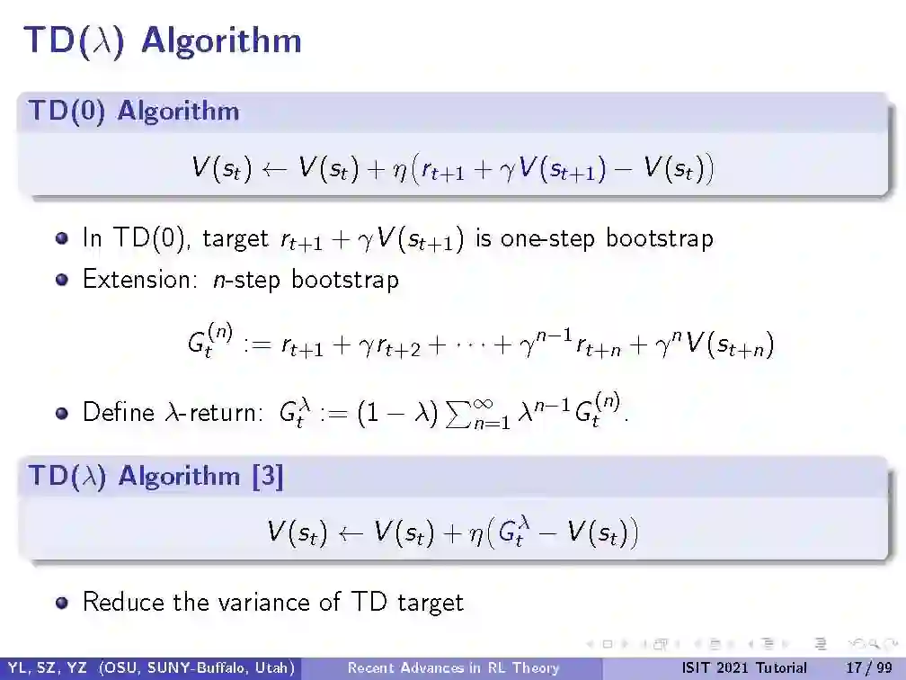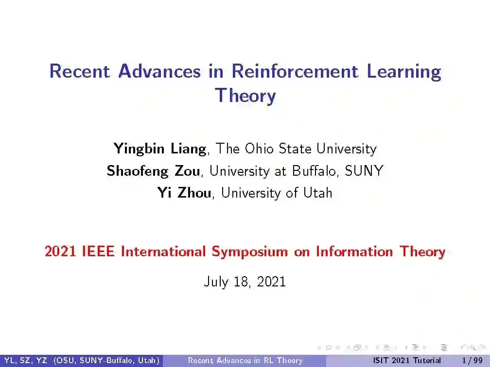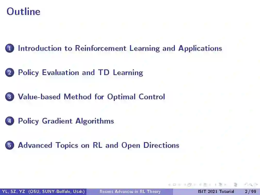 强化学习(RL)通过与复杂环境的交互,推动机器学习从基础数据拟合到学习和规划的新时代。RL具有深度学习功能,在自动驾驶、推荐系统、无线通信、机器人、游戏等领域取得了巨大的成功。RL的成功很大程度上是基于RL算法的基础发展,直到最近才被彻底理解,特别是它们的有限时间收敛速度和样本复杂性。本教程将全面概述基础RL算法的理论理解的最新进展,利用随机近似/优化理论和利用RL问题的马尔可夫结构。本教程还将介绍一些高级的RL算法及其最近的发展。