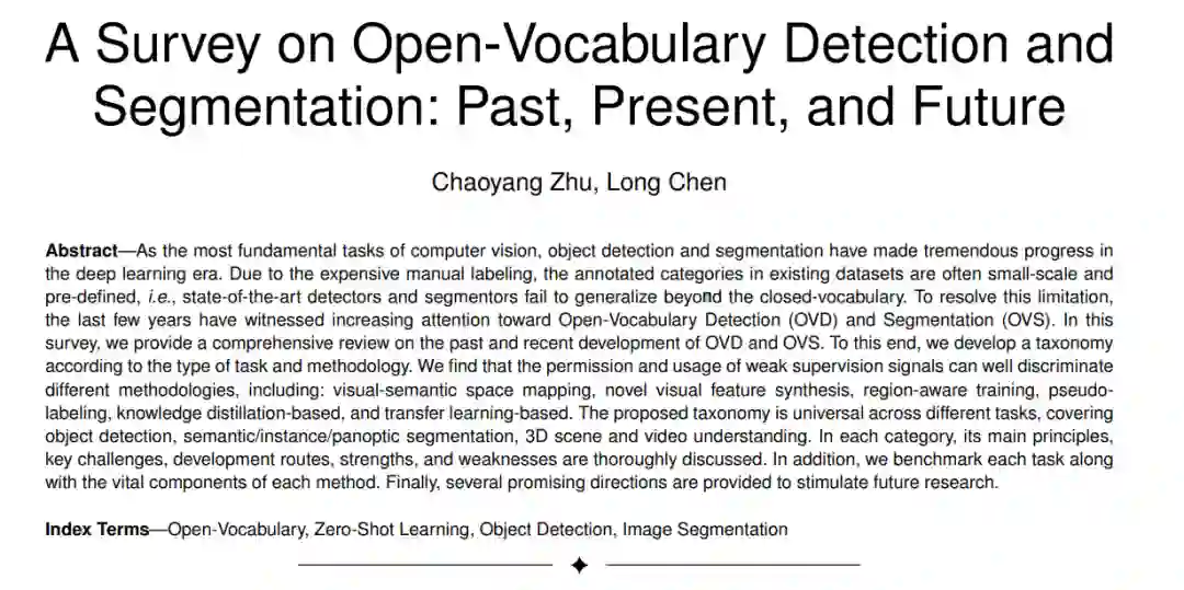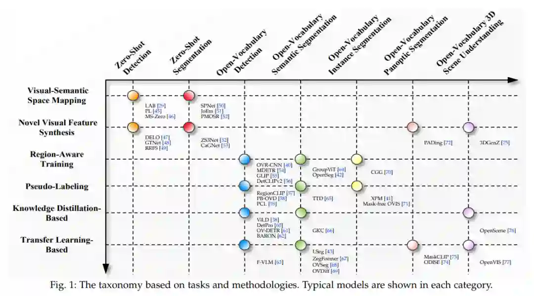 在这篇综述中,我们使用术语“开放词汇”来总结传统的零样本和新兴的开放词汇设置的方法,原因如下:1) 零样本和开放词汇设置都允许进行超出固定词汇的目标检测和分割;2) 两种设置之间的方法学可以共享,例如新颖的视觉特征合成可以无缝地转换为开放词汇设置;3) 鉴于图像-文本对的存在和大型VLMs的兴起,开放词汇设置更加现实和有前景。目前的OVD和OVS实验设置因方法而异,导致性能比较不完整,并且直接比较可能对某些方法不公平。为了缓解这个问题,我们另外提供了一个包含每种方法的关键组成部分的综合基准。按照我们的分类系统,本文的其余部分组织如下:第2节描述了OVD和OVS的形式化定义,相关领域和任务,传统的封闭集合检测器和分割器,大型VLMs,以及常见的数据集和评估协议。然后,我们在第3节和第4节回顾ZSD和ZSS,第5节和第6节回顾OVD和OVS。开放词汇的三维场景理解和视频实例分割也在第7节中进行了介绍。最后,第8节得出了结论,讨论挑战和有前景的未来方向。