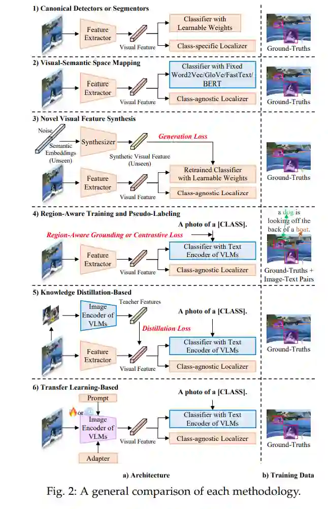 随后,新提出的开放词汇检测(OVD) [40]和分割(OVS) [41],[42],[43]允许模型在带有未标注新对象的图像上进行训练。它们通常通过弱监督信号来解决封闭集合的限制,例如图像-文本对(图像标题或图像级标签),或者来自大型预训练的视觉-语言模型(VLMs),如CLIP [44]。来自CLIP [44]的文本嵌入可以很好地与视觉模态对齐。因此,与ZSD和ZSS相比,OVD和OVS在性能上取得了巨大的飞跃。由于其巨大的应用价值,近年来提出了大量的方法,使得研究人员难以跟上它们的步伐。然而,据我们所知,目前只有少数相关综述可用,而这些综述只关注于有限的任务和设置,因此迫切需要一份更全面的综述,涵盖所有任务和设置。