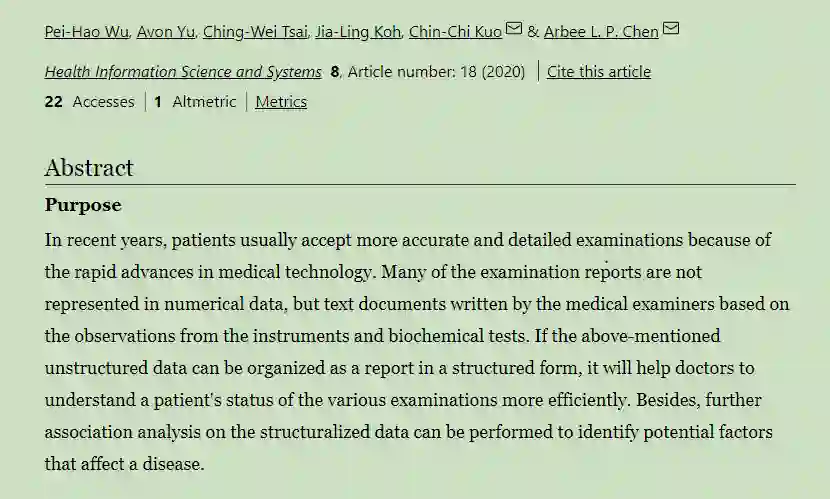 近年来,由于医疗技术的飞速发展,患者通常接受更准确和详细的检查。 许多检查报告未在数字数据中显示,而是由医学检查员根据仪器和生化测试的观察结果编写的文本文件。 如果上述非结构化数据可以结构化形式作为报告进行组织,它将有助于医生更有效地了解患者各种检查的状况。 此外,可以对结构化数据进行进一步的关联分析,以识别影响疾病的潜在因素。