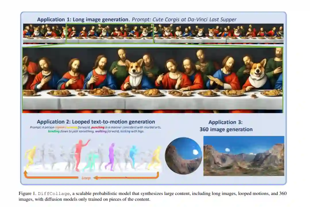 本文提出DiffCollage,一种组合式扩散模型,可以通过利用在生成大型内容片段上训练的扩散模型来生成大型内容。该方法基于因子图表示,其中每个因子节点表示内容的一部分,变量节点表示它们的重叠部分。这种表示允许聚合在单个节点上定义的扩散模型的中间输出,以并行生成任意大小和形状的内容,而无需借助于自回归生成过程。将DiffCollage应用于各种任务,包括无限图像生成、全景图像生成和长时间文本引导的运动生成。与强自回归基线进行比较的广泛实验结果验证了所提出方法的有效性。