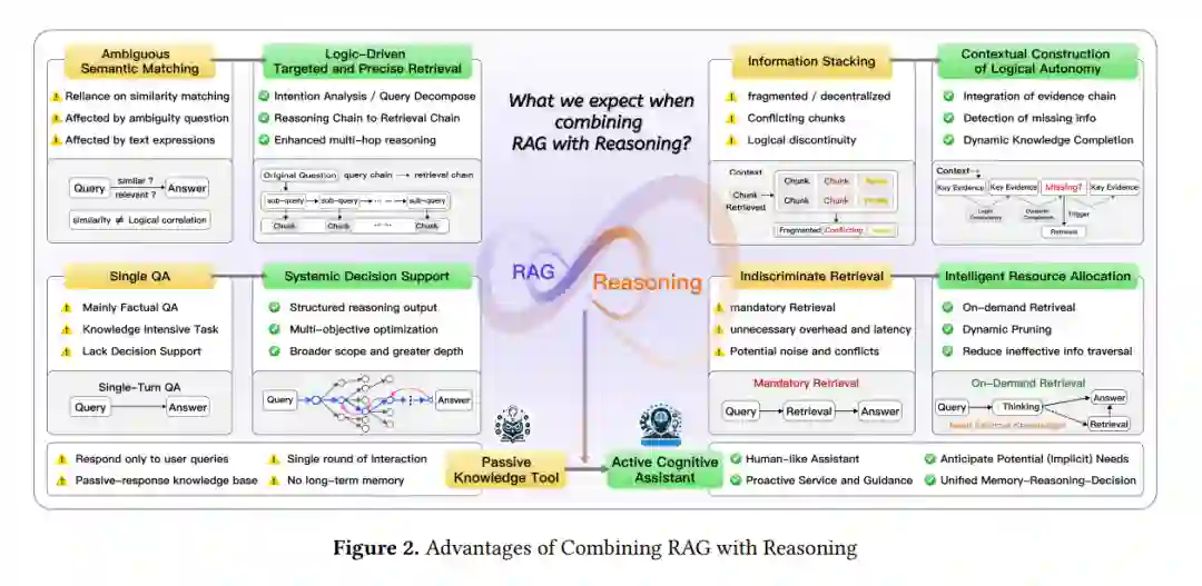 将推理与RAG结合解决了传统RAG系统的局限性,这些系统由于依赖于表面语义匹配和固定的知识边界,在多步逻辑、上下文适应和隐性知识合成方面表现不佳。增加推理能力使得动态检索规划成为可能,能够对证据进行逻辑验证,并通过溯因推理或反事实推理生成超越检索数据的洞见。同时,外部知识检索的引入有助于缓解LRM知识限制所造成的推理中断,减少幻觉的可能性。这种集成方式主要有两种形式:推理增强检索,即推理驱动上下文感知的信息收集;检索增强推理,即外部知识支持并扩展模型的演绎能力。