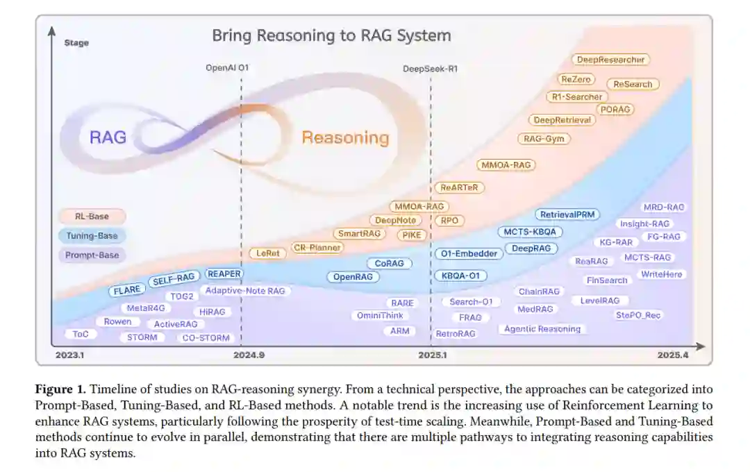 最近,像OpenAI O1 [39] 和DeepSeek-R1 [25] 等大型语言模型(LLMs)在推理能力方面的突破,已将范式从“预训练扩展”转变为“测试时扩展”[63]。与传统的语言模型通过在预训练期间累积语料来提高性能不同,这些模型通过推理阶段的后期训练创新(例如,Long-CoT思维[8])提升了在复杂任务中的表现——如数学推导和代码生成[29]。这一转变催生了“大型推理模型”(LRMs)[99],这些模型具有先进的内部推理能力。这些进展不仅提升了基本模型的能力,还为检索增强生成(RAG)[21] 等应用技术开辟了新的前景。作为语言模型与外部知识之间的关键纽带,RAG通过实时检索非参数化信息并将其融入上下文,克服了传统LLMs在知识新鲜性、领域特异性和事实准确性方面的局限。这增强了信息处理,并减少了在知识密集型任务中的幻觉风险。 随着技术进步,RAG架构通过查询重写[61]、重排序[1]和混合检索[88]等创新不断发展,创建了一个专注于预检索优化和后检索精炼的先进RAG范式。模块化RAG [22] 进一步将这些系统细分为基于组件的、面向服务的架构,通过编排来解决实际挑战。尽管在查询意图识别和知识使用方面有所改善,但RAG在深度研究和复杂决策等高要求任务中仍面临挑战。关键问题包括:1)从模糊查询中捕捉意图的困难;2)多跳推理中的逻辑连贯性差;3)传统检索在开放域中的效率限制;以及4)从噪声检索数据中生成质量下降。 像DeepSeek-R1等具有强大推理能力的模型,为RAG系统开辟了新的方向。如图1所示,最近的研究探索了将形式化推理框架与知识检索相结合的方法。这种方法通过逻辑驱动的查询重构来优化检索,并利用推理分析和验证检索的知识,在检索与生成之间创造认知协同作用。该范式旨在克服传统的局限,打造具有严格逻辑和可靠知识使用的智能系统。从趋势角度看,越来越多的方法通过强化学习(RL)结合推理与检索能力,标志着LRM时代的新方向。与此同时,基于提示的方法持续快速发展,研究人员通过工作流设计来实现结果,同时保持模型参数冻结。值得注意的是,单一依赖调优方法的情况正在逐步减少,这表明在这一阶段,额外微调带来的改进有限。 传统RAG受到其单向流(检索→生成)的限制。通过集成推理能力,系统获得了更大的自主性,解锁了新的可能性。如图2所示,这种集成有望推动重大突破,使其能够在复杂的现实场景中得到实际应用。 1)从模糊语义匹配到逻辑驱动的目标化检索。传统RAG依赖于语义相似度进行检索;然而,它对措辞变化很敏感。先进的推理允许对查询进行深度逻辑分析(例如,因果关系、条件约束),以动态地优化检索策略[24]。例如,回答“如何降低糖尿病患者的术后感染风险?”时,系统优先检索“血糖控制阈值”和“抗生素使用指南”,而不是简单地匹配“糖尿病术后护理”。这种方法支持多跳检索,通过推理链保持跨文档的连贯性,同时将复杂查询分解为顺序子查询。 2)从简单的信息汇聚到逻辑连贯的上下文构建。当前的RAG系统将所有检索到的文档块直接输入上下文,这往往导致碎片化或矛盾的信息,使LLMs困惑。增强推理的系统通过逻辑验证和推断检索内容中的因果关系,整合证据链,过滤冲突并形成连贯的解释[100]。它们还利用动态知识补全来检测缺失的逻辑链接,提示进行迭代检索或推理来填补空白[51]。 3)从简单的单轮问答到系统性的决策支持。传统RAG在事实问答[65]中表现良好,但在多步和复杂决策中表现较差。集成推理的系统能够生成结构化的推理输出,增强多目标优化,在各种约束下平衡检索的广度和解决方案的可行性。例如,在工程建设方案中,不同条件下的多重约束[54],以及医疗领域中各种疾病的诊断和治疗方案的制定[105]。 4)从不加区分的检索到智能资源分配。传统RAG为所有查询进行检索,无论其复杂性如何。增强推理的系统采用按需检索,简单查询通过直接生成处理,复杂查询通过多轮检索来减少延迟[20]。动态检索修剪使用预推理预测来定位关键信息,最小化不必要的文档和图形遍历[41]。 5)从被动知识工具到主动认知助手。超越反应式知识检索,增强推理的系统能够通过提问澄清问题并预测隐含需求,主动为用户服务。这种转变使得集成记忆、推理和决策的类人助手成为可能,对于深度研究[43]、商业分析[50]、个人助手[107]和城市规划[85]等复杂任务尤其有价值。 然而,RAG与推理之间的协同路径不仅仅是简单地用LRM模块替代传统生成型LLMs。它需要深入整合来自LRM的技术演化洞察——通过重构知识检索机制和强化推理-生成的协同链接——从而在RAG架构中实现系统级的认知能力提升。 因此,本文旨在解决“RAG系统如何与推理能力协同工作”的关键前瞻性研究问题。我们对2024年之后的相关研究进行了系统综述,并明确界定了RAG语境中的推理定义。在此基础上,我们提供了一个深入的分类体系和分析,揭示RAG-推理集成的目标、典型模式和实现方式,阐明关键技术轨迹和突破点。 随着RAG技术进入下一个发展阶段,下游任务的复杂性显著增加——特别是在深度研究等新兴挑战中尤为明显[106]。这些先进的应用不仅要求提升推理能力,还推动RAG向多模态、跨领域和动态环境扩展。然而,尽管推理能力的集成显著提高了复杂任务的表现,现有研究往往忽视了与之相关的计算开销和潜在风险。通过系统地检视这些操作约束并分析行业应用,