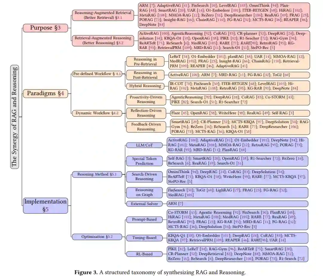 将RAG与推理相结合标志着在应对复杂的知识密集型任务时的一种范式转变。本文基于三个关键问题(目的、范式和实现),开发了一个分层的分类体系(图3)。这一框架引导读者通过后续章节中的技术创新,提供一个清晰的概念路径,而不涉及过早的技术细节,并突出了该领域的演变逻辑,避免过早深入具体的技术细节。