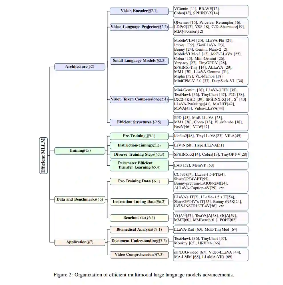 在本综述中,我们旨在呈现快速发展的高效MLLMs领域的最新进展,如图2所示。我们将文献组织成六个主要类别,涵盖高效MLLMs的各个方面,包括架构、高效视觉、高效LLMs、训练、数据和基准测试以及应用。Architecture 关注通过高效技术开发的MLLM框架,以降低计算成本。该架构由多个基于模态的基础模型组成,具有不同于单模态模型的特征,从而促进了新技术的发展。