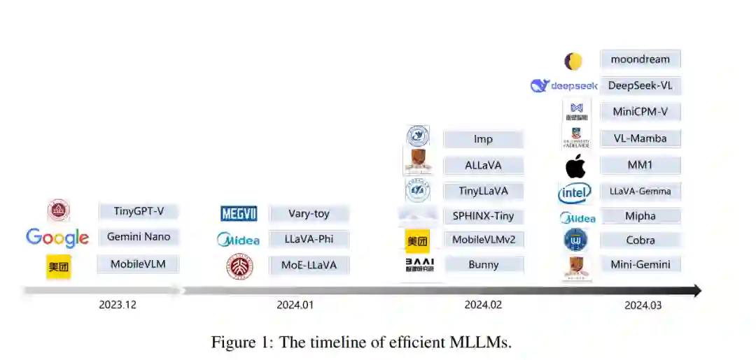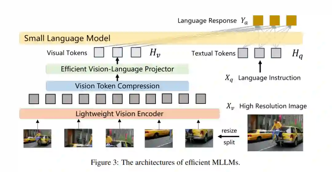 鉴于这些挑战,高效MLLMs的研究受到了越来越多的关注。这些努力的主要目标是减少MLLMs的资源消耗,扩大其适用性,同时尽量减少性能下降。高效MLLMs的研究始于用轻量级替代品替换大型语言模型,并进行典型的视觉指令微调。随后,研究进一步通过以下方式增强了能力并扩展了用例:(1)引入更轻量的架构,注重效率,旨在减少参数数量或计算复杂度[25, 13, 18];(2)开发了更专业的组件,聚焦于高级架构的效率优化或赋予特定属性,如局部性[19, 17, 12];(3)支持资源敏感任务,一些工作采用视觉token压缩来提高效率,使MLLM的能力能够转移到资源密集型任务中,如高分辨率图像和视频理解[35, 39, 14, 40]。
