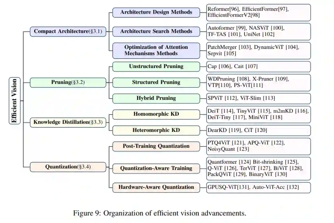Vision Transformer (ViT) [94] 架构在计算机视觉应用中获得了显著的关注并被广泛使用。然而,随着ViT模型规模的增长,可训练参数和操作数量也随之增加,影响了它们的部署和性能。此外,自注意力机制的计算和内存成本随着图像分辨率的增加呈二次增长。参考论文[95],本综述旨在探索可用于高效MLLMs的最有效的视觉编码方法。