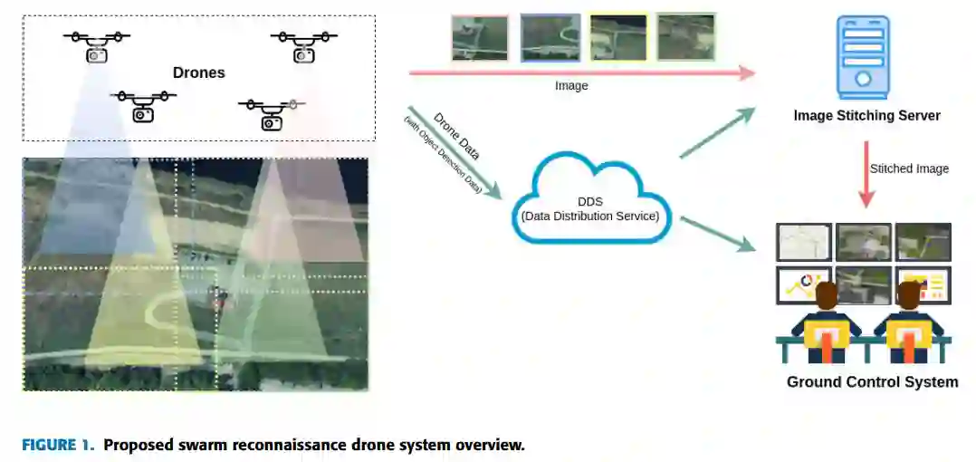 本文提出了一种基于数据分布服务的蜂群侦察无人机系统,如图 1 所示,该系统使用安全的集成指令同时控制和操作多架无人机。所提出的系统接收来自每架无人机的独立图像,并对图像进行拼接,同时实时检测无人机内的物体。因此,地面控制系统(GCS)可实时提供全面的态势感知。通过基于无人机获取的拼接图像的目标检测测试,对所提出的系统进行了验证。