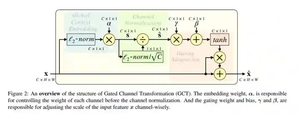 本文针对深度卷积神经网络提出了一种常规的、易应用的变换单元,即Gated Channel Transformation (GCT) 模块。GCT结合了归一化方法和注意力机制,并使用轻量级的、易于分析的变量来隐式地学习网络通道间的相互关系。这些通道量级的变量可以直接影响神经元间的竞争或者合作行为,且能方便地与卷积网络本身的权重参数一同参与训练。通过引入归一化方法,GCT模块要远比SE-Nets的SE模块轻量,这使得将GCT部署在每个卷积层上而不让网络变得过于臃肿成为了可能。本文在多个大型数据集上针对数种基础视觉任务进行了充分的实验,即ImageNet数据集上的图片分类,COCO上的目标检测与实例分割,还有Kinetics上的视频分类。在这些视觉任务上,引入GCT模块均能带来明显的性能提升。这些大量的实验充分证明了GCT模块的有效性。