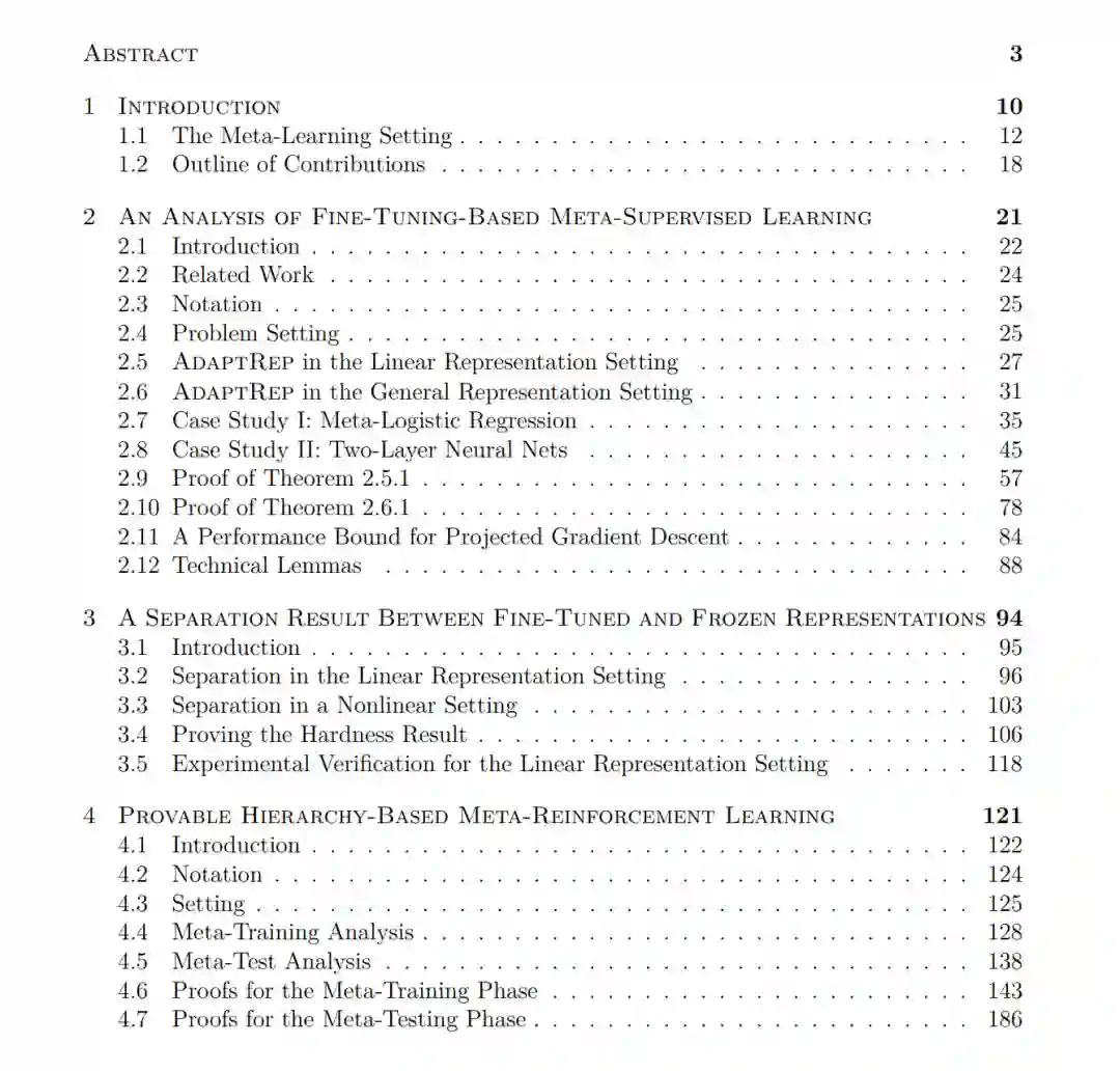 近年来,机器学习领域广泛采用大型基础模型(foundation models)。尽管这些模型具有很强的表达能力,但在针对有限的领域特定数据集进行训练时,仍容易出现过拟合。因此,在数据稀缺的场景下,借助更大但间接相关的数据集进行训练以提取有用的表征,以及更一般意义上的“元学习”(meta-learning),已成为高效使用此类模型的关键。本论文从理论角度研究了元学习背后的基本假设,聚焦于两个设置: