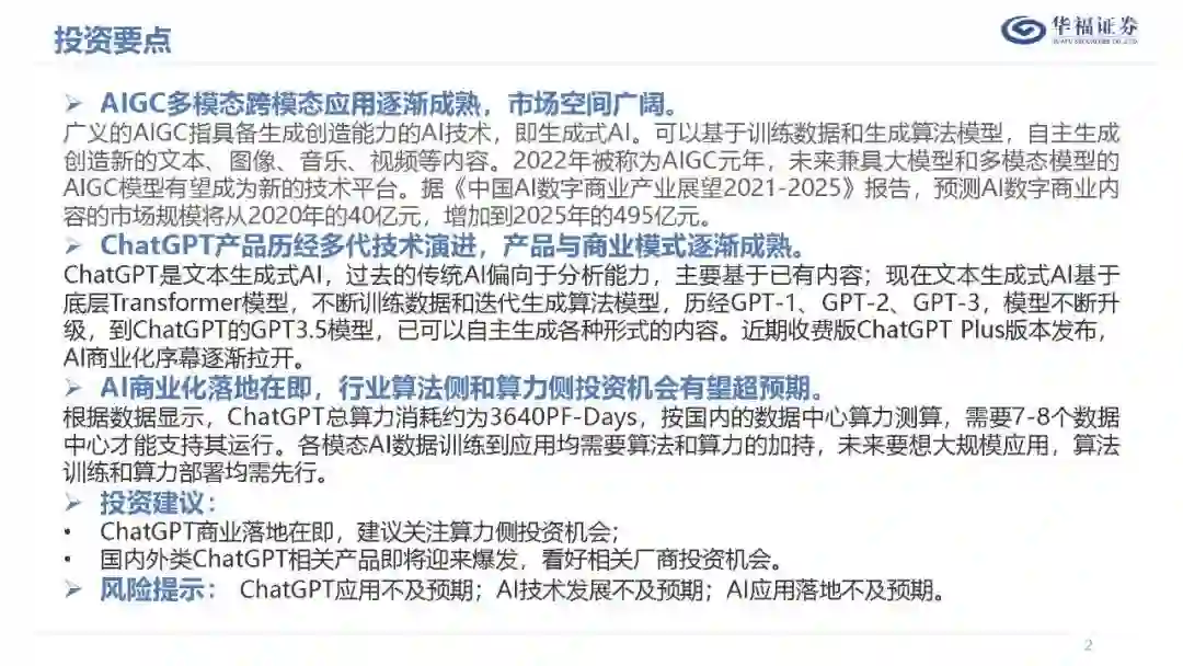 【ChatGPT系列报告】AIGC专题二:ChatGPT更懂人类的叙事 AIGC多模态跨模态应用逐渐成熟,市场空间广阔。 广义的AIGC指具备生成创造能力的AI技术,即生成式AI。可以基于训练数据和生成算法模型,自主生成创造新的文本、图像、音乐、视频等内容。2022年被称为AIGC元年,未来兼具大模型和多模态模型的AIGC模型有望成为新的技术平台。据《中国AI数字商业产业展望2021-2025》报告,预测AI数字商业内容的市场规模将从2020年的40亿元,增加到2025年的495亿元。 ChatGPT产品历经多代技术演进,产品与商业模式逐渐成熟。 ChatGPT是文本生成式AI,过去的传统AI偏向于分析能力,主要基于已有内容;现在文本生成式AI基于底层Transformer模型,不断训练数据和迭代生成算法模型,历经GPT-1、GPT-2、GPT-3,模型不断升级,到ChatGPT的GPT3.5模型,已可以自主生成各种形式的内容。近期收费版ChatGPTPlus版本发布,AI商业化序幕逐渐拉开。 AI商业化落地在即,行业算法侧和算力侧投资机会有望超预期。 根据数据显示,ChatGPT总算力消耗约为3640PF-Days,按国内的数据中心算力测算,需要7-8个数据中心才能支持其运行。各模态AI数据训练到应用均需要算法和算力的加持,未来要想大规模应用,算法训练和算力部署均需先行。