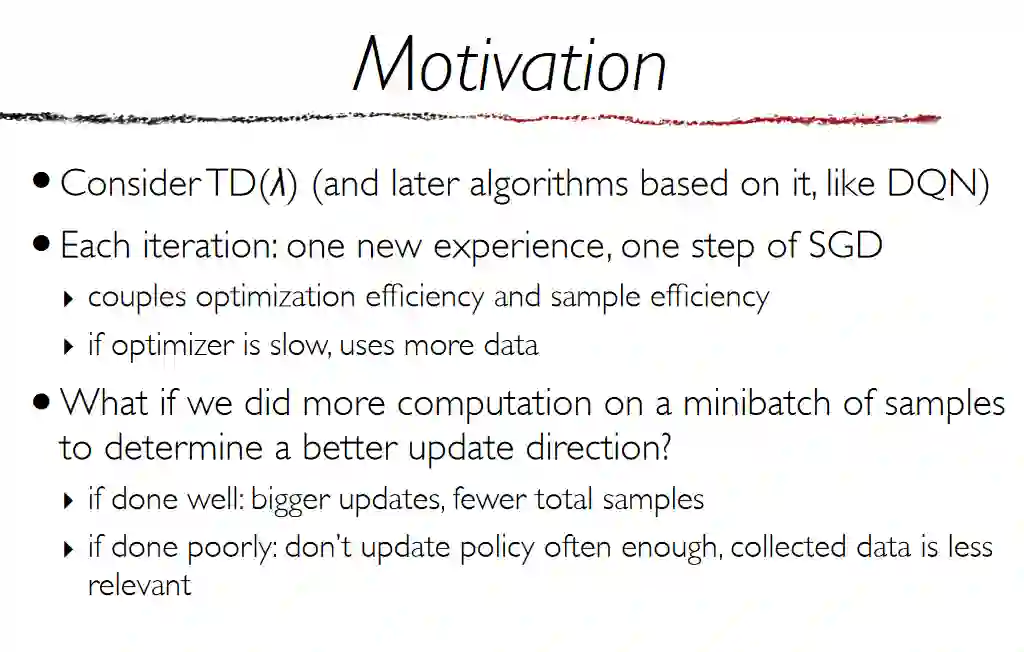 摘要: 强化学习在经验易获得的领域取得了许多成功,如电子游戏或棋盘游戏。这类区域的RL算法通常基于梯度下降:它们以较小的学习率进行许多噪声更新。相反,我们研究每次更新花费更多计算的算法,试图减少噪声并进行更大的更新;当经验比计算时间更昂贵时,这样的算法是合适的。特别地,我们看几种基于近似策略迭代的方法。