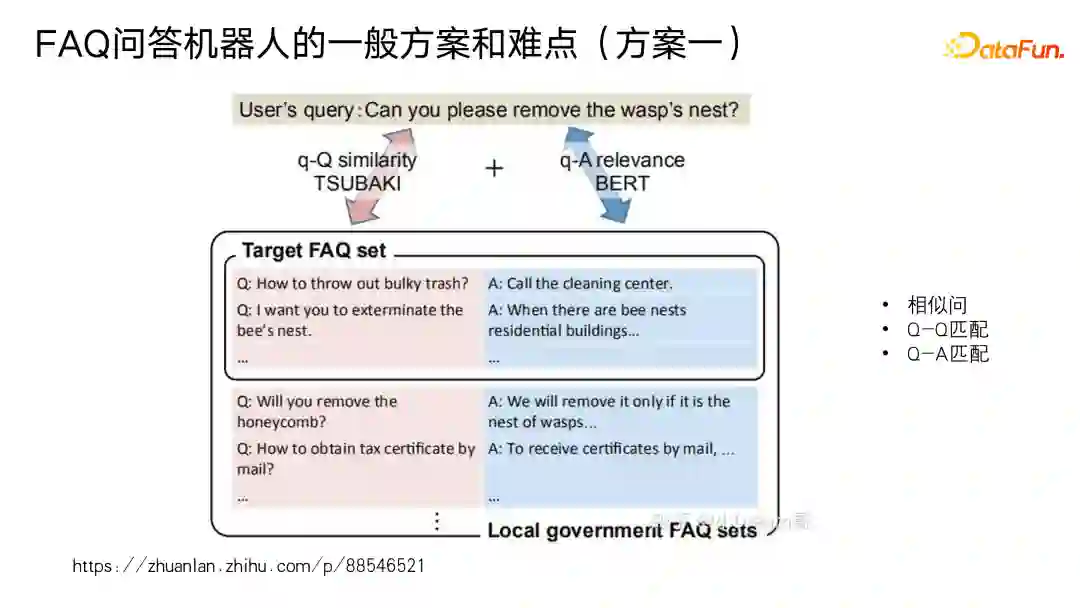 大语言模型的实践探索在本节中,将介绍大型语言模型在实际操作中的探索。随着去年 LLAMA-70B 模型的问世,我们见证了开源大模型数量的显著增加,并借此机会进行了一系列的实践探索。这些探索主要基于 Transformer 结构,可分为三大类:语言理解、语言生成以及机器翻译相关任务。具体到问答机器人,我们尝试了 FAQ 问答,针对常见问题提供快速响应;此外,我们还开展了基于汽车手册或企业内部知识文档的长文本问答实践。在传统 NLP 任务方面,借鉴 OpenAI 发布的 GPT-2 研究成果,我们测试了模型在文本分类上的能力,并尝试利用其生成报告的摘要。在 AI 代理的应用上,我们开发了自然语言查询数据库的功能,允许不具备编程技能的用户通过自然语言完成数据库查询,尤其适用于无法直接生成报表的临时查询。进一步地,我们还探索了 AI 代理在更广泛任务中的应用,例如自动填写请假申请等行政事务。接下来,将详细介绍 FAQ 问答机器人的应用场景。在大模型兴起之前,常规做法是建立并维护一个问答知识库,对用户提出的查询进行匹配,匹配工作通常是 Q-Q 的相似性,或是 Q-A 间的相似性,有时则是将这两者结合起来进行。这一过程最终会产出一个答案。这里的主要挑战包括相似问题的生成,因为标准问题的变体可能非常多,这就需要大量的人力投入。另一个挑战是语义相似度模型的匹配准确度,Q-Q 和 Q-A 的匹配质量完全取决于相似度模型的性能,这就使得其语义理解的能力相对较弱。