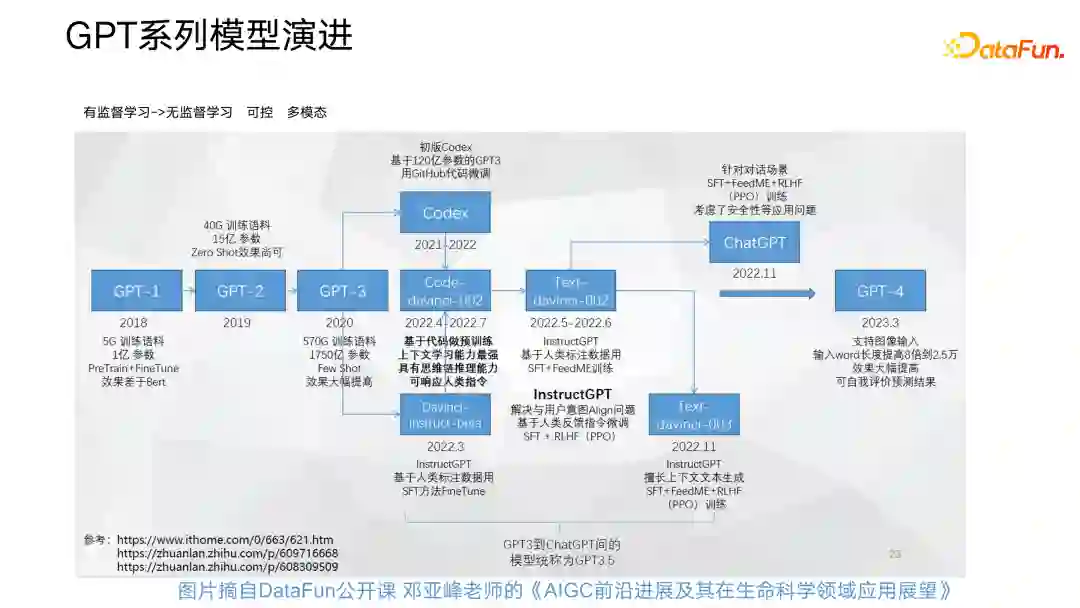下图详细阐述了 GPT 系列模型的演进历程。自 Transformer 模型问世以来,OpenAI 以此为基础,提出了一种新的范式:利用预训练加微调的方法来处理自然语言任务。GPT-1 采用了 5GB 的训练语料和 1 亿参数,尽管其性能不及随后Google 推出的 BERT 模型,但 OpenAI 坚信未来的发展应朝向无监督学习方向迈进。因此,在 2019 年,OpenAI 推出了 GPT-2,使用了 40GB 的训练数据和 15 亿参数,并实施了 Zero-shot 学习,能在模型未接触过的任务上进行作业,尽管生成的文本已相对较长,但仍存在改进空间。随后,OpenAI 以 570GB 的数据训练量和 1750 亿参数推出了 GPT-3。与前作相比,GPT-3 采用了 Few-shot 学习方法,仅需少数样本即可显著提升性能,实现了接近监督学习最优效果的无监督学习能力。GPT-3 之后,OpenAI 转而专注于模型的可控性问题。GPT-3 虽然功能强大,但其输出内容有时并不完全符合人类的意图。这一挑战促使 OpenAI 发展出 ChatGPT,旨在从有监督学习向无监督学习转变,同时从不可控走向可控,进而发展至今日的多模态方向,标志着自然语言处理技术向更加高级的发展阶段迈进。