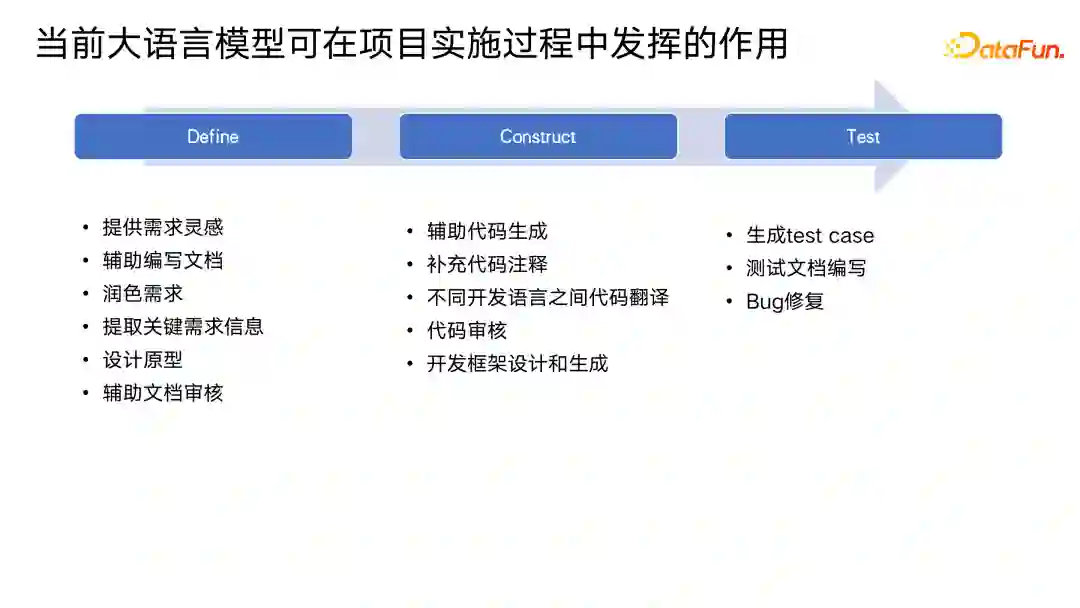 数据分析人员的要求关于数据分析人员的能力要求,大模型的出现确实引发了一部分人的焦虑,担心自己的工作会被取代,或者担心赶不上这一技术浪潮。然而,我认为大模型不会取代我们的工作,而是会成为我们完成任务的强大助手,促使我们做出积极的改变。通过前期的一些探索,我们发现大语言模型实际上能在数据分析工作中发挥重要作用。在项目实施过程中,大模型可以在多个阶段提供支持。例如,在需求定义阶段,它能够提供需求灵感、辅助编写和润色文档,提供关键需求信息,甚至在我们还未完全明确需求时补充设计元素。它还能帮助审核文档,确保关键信息的包含。在构建阶段,大模型能辅助生成代码,补充代码注释,以及进行不同开发语言之间的代码翻译。这在一些拥有较老系统需要语言转换的公司中尤其有用,特别是当这些系统的代码注释不够充分时。此外,大模型还能进行代码审核,确保代码符合公司的要求,辅助开发框架的设计和生成。在测试阶段,大模型能够帮助生成测试用例、编写测试文档以及修复 bug。这些都是在大模型应用场景中应该考虑到的作用。