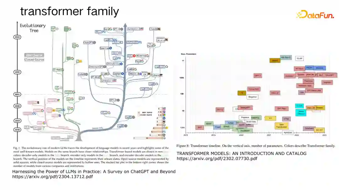 ****人工智能技术蓬勃发展,并于 2012 年开始加速。那一年,Hinton 及其指导的学生通过 AlexNet 网络在 2012 年 ImageNet 图像分类大赛中夺冠,标志着深度学习技术重新获得了广泛关注。自 2012 年至 2017 年间,有监督学习技术成为了主流,期间图像处理技术迅猛发展,然而自然语言处理领域却未能实现突破性进展。这个阶段在解决自然语言处理问题时,虽然采用了循环神经网络、长短期记忆网络等复杂的网络结构,但仍未能解决自然语言处理领域的核心问题,如长期依赖导致的梯度消失问题、处理效率无法并行化,以及依赖大量标注数据的监督学习模式使得数据获取成本高昂。正因如此,该时期自然语言处理领域并未实现显著的突破。然而,一切在 2017 年发生了转变,Google 发布了开创性的论文《Attention is All You Need》,首次提出了基于注意力机制的 Transformer 网络架构。这种架构完全舍弃了传统的循环和卷积网络结构,实现了模型的并行化处理和自监督学习,使得大量未标注数据得以有效利用。并行化处理降低了计算复杂度,加速了大规模计算任务的处理速度。Transformer 网络的提出促进了大规模预训练模型的兴起,标志性地将我们的研究方向分为三个主要类别:基于 Transformer 的 Encoder-Decoder 结构,分别形成了 Encoder 类、Decoder 类以及 Encoder-Decoder 的预训练模型。例如,2018 年提出的 BERT 模型,属于 Encoder 类,能够执行阅读理解等任务,通过上下文推断含义;而 GPT 系列模型,作为 Decoder 类,侧重于根据前文预测后文;Encoder-Decoder 模型则在如机器翻译等任务中表现出色。这些创新大大推动了自然语言处理技术的发展。从下图中可以看到基于 Transformer 架构衍生出的各类大型模型。左侧图展示了三个主要分支:红色代表仅包含编码器(encode only)的模型,中间部分包含编码器和解码器(encode-decode)的模型,而右侧则聚焦于仅含解码器(decode only)的模型。右侧的图则依据模型的规模进行分类。我们可以观察到,自 Transformer 诞生后,随着 GPT-1 的推出,模型规模开始逐渐增大。随后,BERT 的问世以及 GPT 系列的持续发展,在 Transformer 架构的基础上不断演进,展现了模型规模的快速增长趋势。