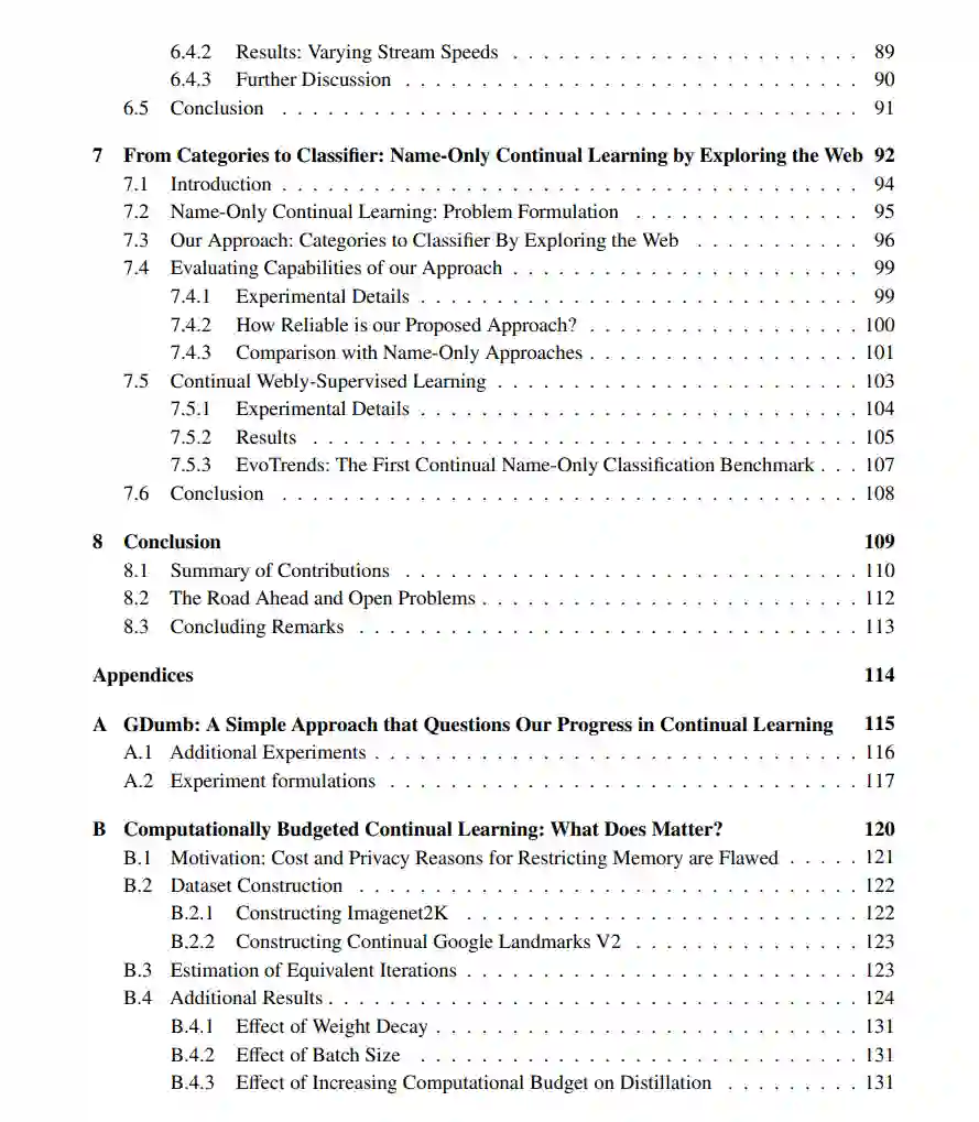 - 通用问题定义与在线数据流相关性的关注:我们提出了一个受开放集识别问题启发的CL分类问题通用定义,要求模型从数据流中持续适应新类别。我们详细说明了持续学习中的一些假设可能过度简化问题,从而降低了其实际相关性。我们的GDumb模型表明,即使是不使用在线数据流的简单消融实验,也能匹配或超越为特定持续学习场景设计的算法,挑战了该领域的进展。
