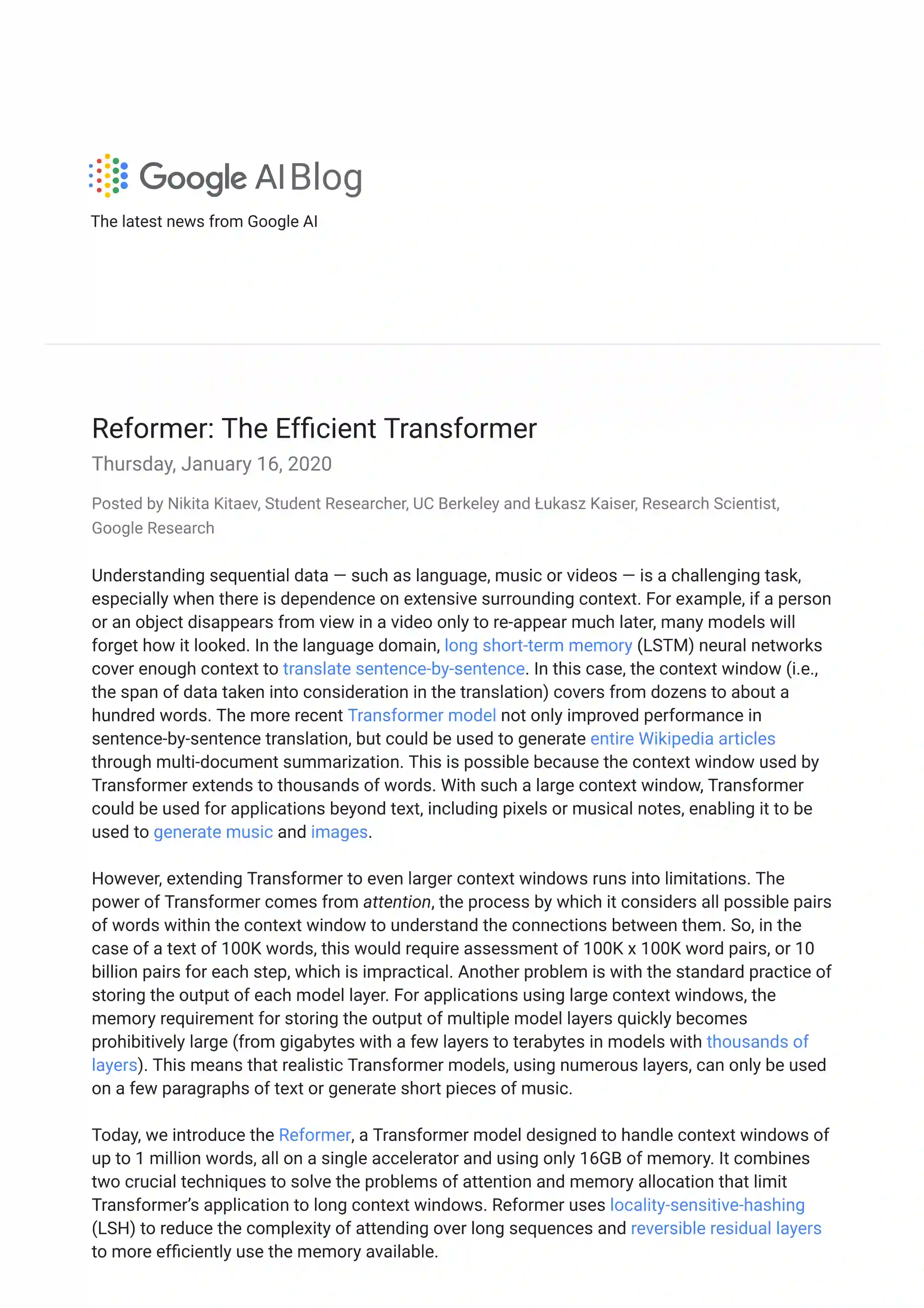理解序列数据——如语言、音乐或视频——是一项具有挑战性的任务,特别在当它依赖于大量的上下文的情况下。例如,如果一个人或一个物体在视频中消失,很久以后又重新出现,许多模型就会忘记它的样子。在语言领域,长短时记忆(LSTM)神经网络覆盖了足够的上下文来逐句翻译。在这种情况下,上下文窗口(翻译时考虑的数据跨度)覆盖了几十到上百个词。近期的Transformer模型不仅改进了逐句翻译的性能,还可以通过多文档摘要生成整个Wikipedia文章。这样可行的原因是Transformer的上下文窗口可以覆盖上千个词。用这样的大上下文窗口,Transformer可以被应用于文本以外的数据,如像素、音符等,这样它可以被用来生成音乐、图像等。