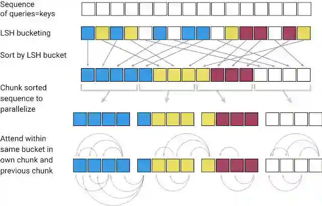 将Transformer模型应用于非常大的文本序列时,第一个挑战是如何处理注意力层。LSH通过计算一个哈希函数来实现这一点,该哈希函数将类似的向量匹配在一起,而不是搜索所有可能的向量对。例如,在翻译任务中,网络第一层的每个向量表示一个单词(后续层中可能表示更大的上下文),不同语言中相同单词对应的向量可能得到相同的哈希。下图中,不同的颜色描绘了不同的哈希,相似的单词有相同的颜色。当哈希值被分配时,序列会被重组,将具有相同哈希值的元素放在一起,并被分成片段(或块),以支持并行处理。之后,注意力机制被应用于这些更短的块中(以及相邻块,以覆盖溢出),从而大幅度减少了计算负载。