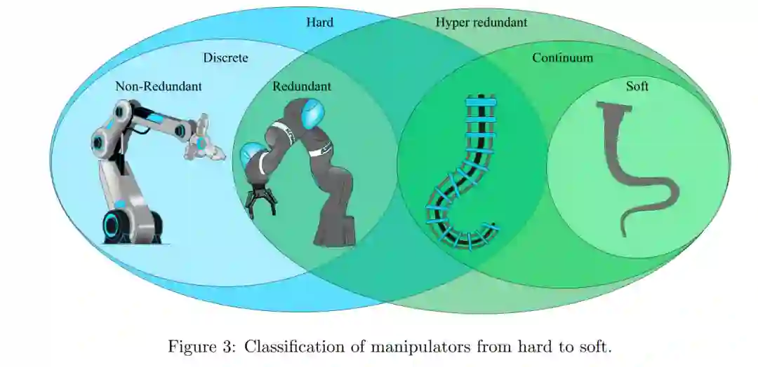 对于人类来说,由于具有独特的视觉能力和具有224个自由度(DoF)和大约630块骨骼肌肉的高度灵活的身体结构,操控不同的物体是一项琐碎的任务[1]。然而,机器人操控是一个复杂的问题,并且是一个活跃的研究领域。原因是,用相应的(可能是简化的)机器人副本来复制自然生物(例如人类)的视觉和动作能力是一项非常具有挑战性的任务。随着机器人结构的复杂性从硬到软的增加(第2节),为它们开发控制器变得更加困难,这是使用机器学习(ML)方法进行机器人控制开发背后的动机。机器人文献包含了多项调查,以追踪机器学习方法,特别是强化学习(RL)和深度学习(DL)在机器人问题中的迅速进展。Amarjyoti[2]专注于应用于学习机器人操控的RL和深度RL(DRL)方法,而没有研究领域特定的应用。此外,Amarjyoti[2]仅考虑了离散机器人,忽略了软性的。Thuruthel等人[3]和Kim等人[4]通过研究软性操纵器的控制策略弥补了这一不足。考虑到机器人操控的复杂性,从头开始学习控制器具有挑战性且有时代价高昂。而且,适应突然的变化和执行多任务并非易事。模仿学习可以用来在机器人上复制专家的行为,并推广到新的环境[5]。模仿学习的演示要么直接,要么间接。像肌肉教学[6]和遥操作教学[7]这样的直接演示中的训练数据是在机器人本身上完成的。间接演示是在没有与机器人互动的单独环境中收集的[8]。简化学习过程的另一种方法是在模拟环境中进行训练,并将学到的技能转移到真实的机器人。这可以通过使用已经广泛评估的模拟到真实方法来实现[9, 10, 11]。