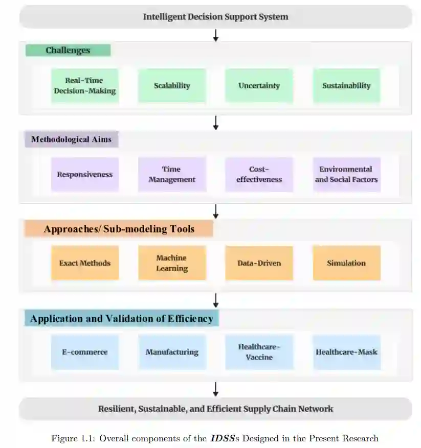 在技术飞速进步、市场波动加剧与全球性中断频发的时代,有效供应链管理需创新方法应对不确定性、复杂性与动态变化。本研究开发并应用一系列新型智能决策支持系统(IDSS),以解决中断环境下的大规模随机动态供应链网络问题。通过电子商务、制造业、医疗健康与可持续性等多元领域案例验证所提系统,具体提出四类弹性IDSS框架:集成先进优化算法、机器学习、强化学习与物流仿真技术,应对重大供应链中断的现实挑战。首个系统通过移动仓库与众包配送优化城市末端配送,显著降低配送时间、成本与环境影响;第二系统开发多阶段随机动态规划模型增强全球供应链弹性,优化不确定性下的物流运作;第三系统聚焦公平高效疫苗分配,采用数据驱动决策降低短缺风险;第四系统设计稳健可持续的口罩分发与回收网络,平衡成本效益、环境影响与客户服务。研究整合精确方法(如并行化随机对偶动态整数规划PSDDiP)、强化学习与混合优化策略,在保障可扩展性与计算效率前提下,提升大规模供应链实时弹性决策能力。既有IDSS多缺乏此类集成,或未考虑中断场景,亦未经过大规模实时验证。实证表明弹性IDSS在提升响应速度、时间管理与成本效益方面潜力显著。中断事件中数据可用性缺口与决策动态适应机制的研究,为政策制定者与实践者提供新洞见。例如,所提在线强化驱动自适应优化(ORDAO)方法,相较交互式多智能体仿真(IMAS)可减少11%配送时间完成同等订单量。