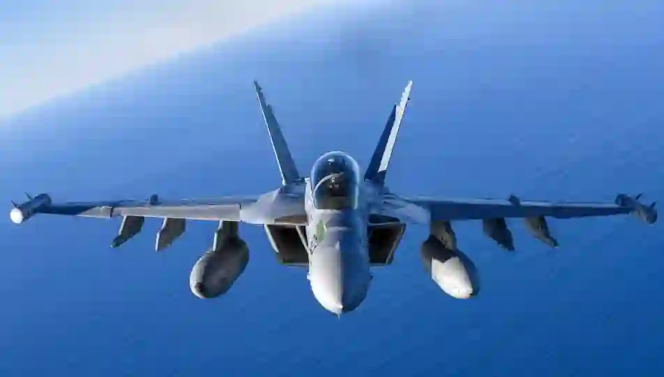 (美国国防部图片:VX-31"沙尘魔鬼"中队的EA-18G"咆哮者"电子战机在穆古角海上靶场执行拍摄任务)