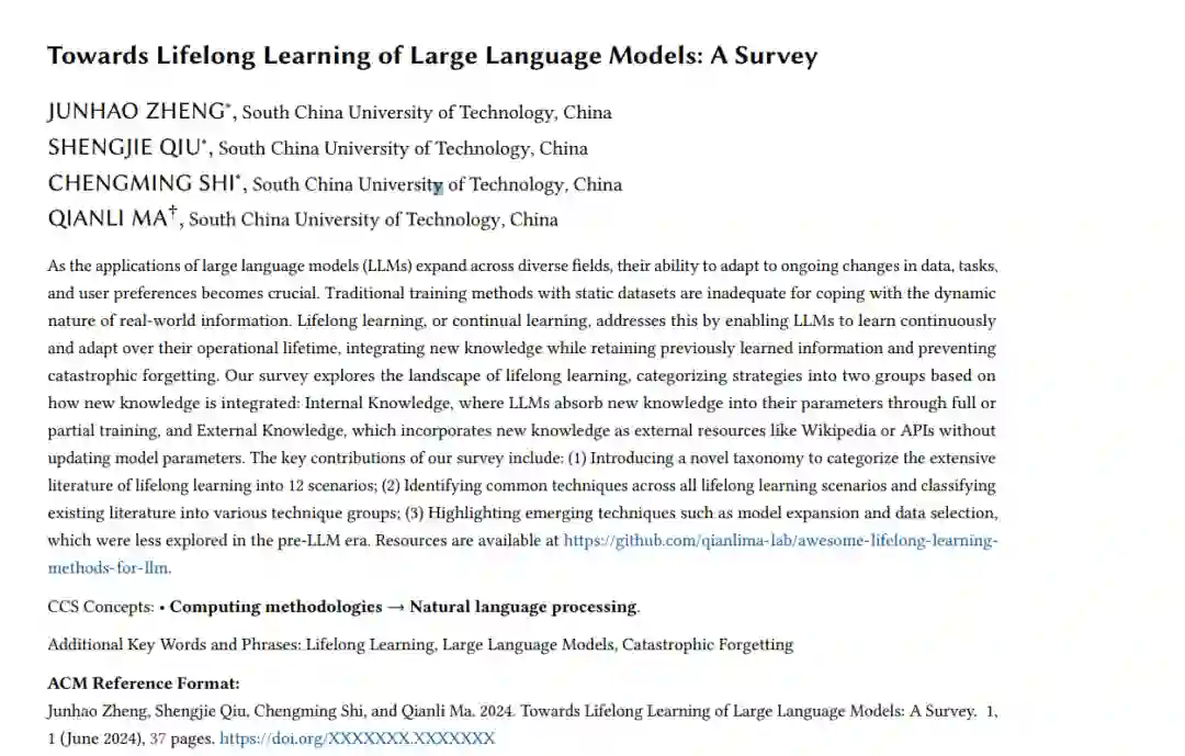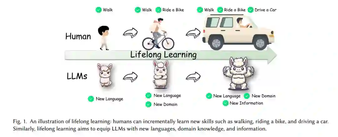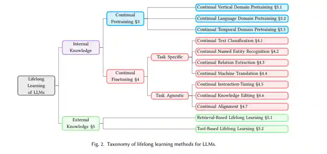 随着大语言模型(LLM)在各个领域的应用不断扩大,这些模型适应数据、任务和用户偏好持续变化的能力变得至关重要。传统的训练方法依赖静态数据集来训练LLM,越来越无法应对现实世界信息的动态特性。终身学习(也称为持续学习、增量学习),或LLM在其运行生命周期内持续和自适应学习的能力,解决了这一挑战,通过整合新知识,同时保留先前学习的信息,从而防止灾难性遗忘。图1提供了终身学习的示意图。 本综述深入探讨了终身学习的复杂领域,根据新知识的整合方式将策略分为两大类:内在知识和外部知识。每个类别包含不同的方法,旨在增强LLM在各种情境下的适应性和有效性。图2展示了LLM终身学习方法的分类。 内在知识类通过完全或部分训练将新知识吸收到LLM的参数中,包括持续预训练和持续微调等策略。例如,在工业应用中,常采用持续垂直领域预训练,公司经常使用金融等领域的特定数据重新训练其LLM。尽管这提高了特定领域的性能,但也有可能削弱模型的广泛知识基础,说明了在专业适应性和通用知识保留之间保持平衡的挑战。持续微调涵盖了特定情境的方法,如文本分类、命名实体识别、关系抽取和机器翻译等,以及任务无关的方法,如指令微调、对齐和知识编辑。此外,在持续对齐中使用了人类反馈的强化学习,以确保LLM遵守人类价值观,如安全和礼貌,突显了所谓的“对齐税”,即过于专注于特定价值观可能会导致模型的通用能力下降。
