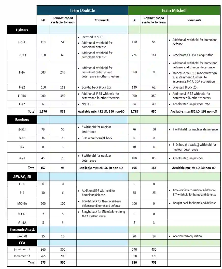 表1:两种不同的2035年空军力量组合。 米切尔研究所在一个关于台海的想定场景中,为两支扮演空战策划者的蓝军分配了不同的2035年力量组合。这为比较两支团队如何计划部署和运用其力量的独立决策奠定了基础。这两种力量组合是基于米切尔研究所对国防部/战争部力量规划趋势和采购项目的评估。
