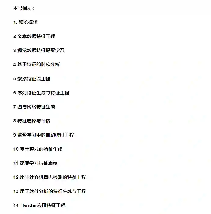 2018年出版了一本关于功能工程的新编辑书,其中12篇由主要专家就特征工程的不同方面提供章节。由于特征工程通常是特定于数据类型且依赖于应用程序的,本书包含专门介绍主要数据类型的特征工程的章节,如文本数据、图像数据、序列数据、时间序列数据、图形数据、流数据、软件工程数据、Twitter 数据和社交媒体数据。这些章节介绍了生成经过反复测试、手工制作的特定于域的功能以及自动通用功能生成方法(如 Word2Vec)的方法。