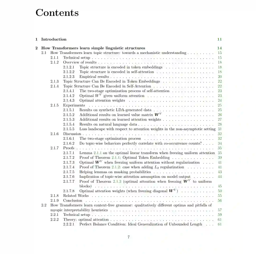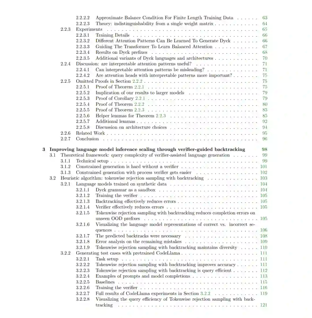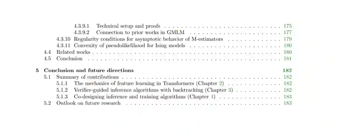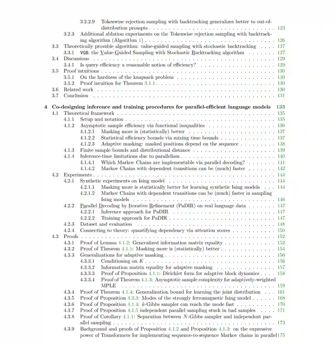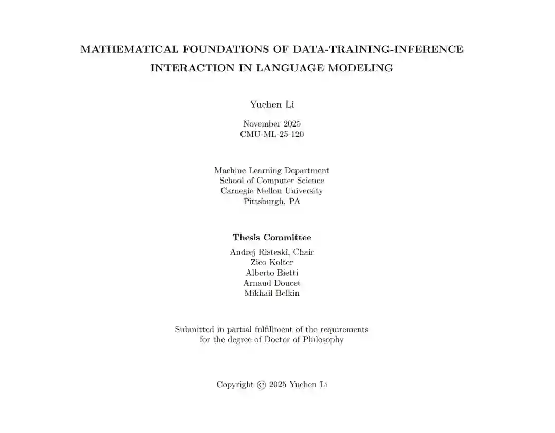 语言模型是一项极其复杂的工程技术成就——目前,研究人员和从业者对其许多维度的(数学和概念层面)理解仍显匮乏。本论文综述了本人旨在开发一套语言模型理论推理方法论的相关研究。该方法论的基础在于:通过关注语言数据中普遍存在的关键结构(如语法和主题),对数据生成过程进行数学建模。这些结构在特定的抽象层次上为数据提供了现实的假设,从而有助于研究数据、训练与推理之间的交互作用。 第 2 章探讨训练过程:本章涵盖了我们阐明 Transformer 架构模型在常规训练程序下如何学习简单语言结构的研究工作。第 3 章探讨推理过程:本章介绍了我们在存在验证器(Verifier)引导自回归语言模型生成器的情境下,关于推理时间缩放(Inference Time Scaling)的研究。最后,第 4 章探讨在并行高效(Parallel-efficient)语言模型的语境下,如何对训练和推理程序进行协同设计。 上述研究结果将现代神经网络架构的理论分析与具体的经验现象(Empirical Phenomena)联系起来,并通过基于合成沙箱(Synthetic Sandboxes)和真实语言数据的实验验证了我们的理论。通过这些进展,本人的研究为推理语言建模中数据、训练与推理之间的交互贡献了数学基础,并激励了基于理解和利用这些交互作用的有原则的(Principled)算法设计。