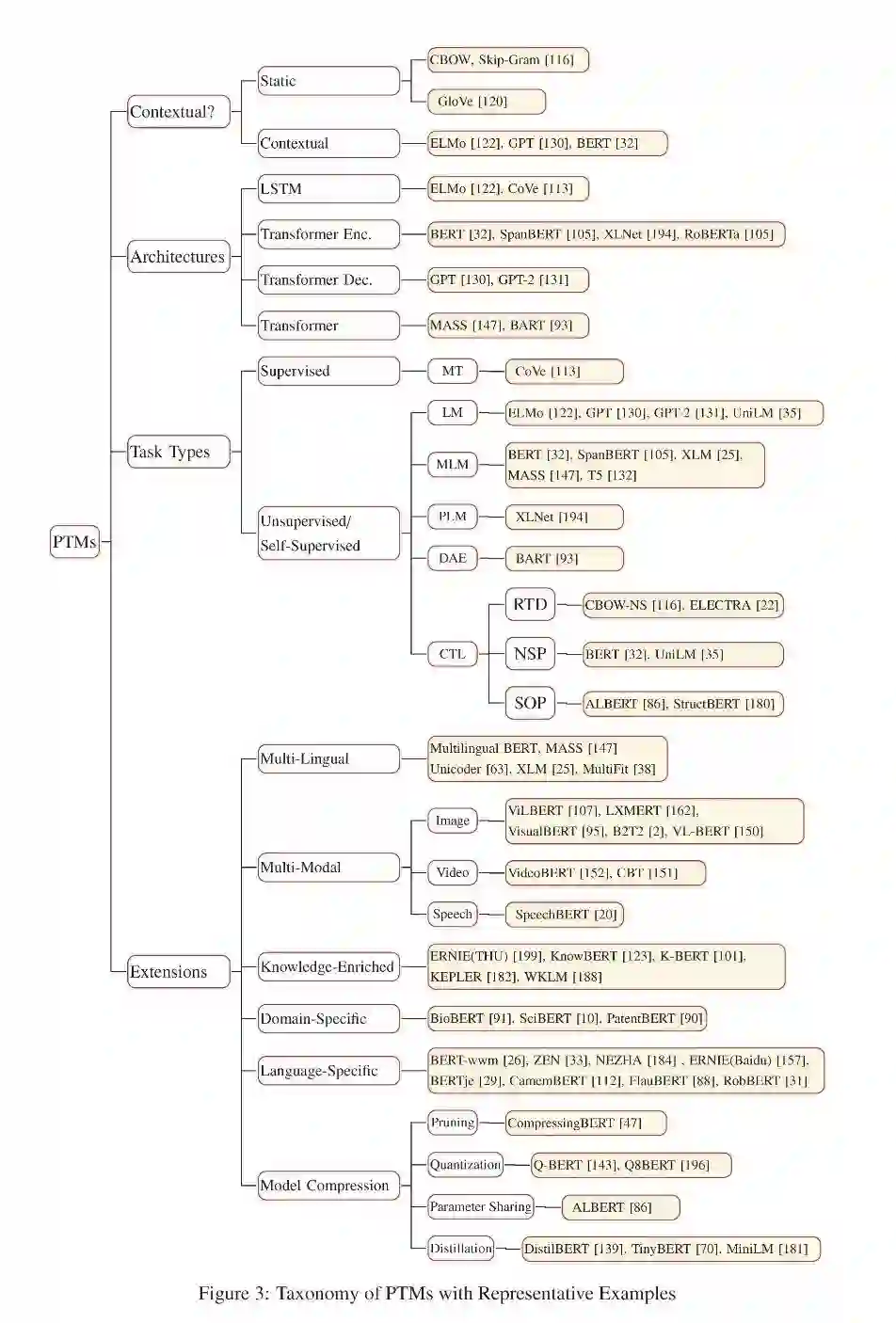 最近大量的工作表明,在大型语料库上的预训练模型(PTMs)可以学习通用语言表示,这对后续的NLP任务是有益的,可以避免从零开始训练新模型。随着计算能力的发展,深层模型(即随着训练技能的不断提高,PTMs的体系结构由浅向深推进。第一代PTM的目标是学习好的词嵌入。由于下游任务不再需要这些模型本身,它们在计算效率方面通常非常肤浅,如Skip-Gram[116]和GloVe[120]。虽然这些预训练的嵌入可以捕获单词的语义含义,但它们是上下文无关的,不能捕获文本的高级概念,如语法结构、语义角色、回指等。第二代PTMs主要学习上下文词嵌入,如CoVe[113]、ELMo[122]、OpenAI GPT[130]、BERT[32]等。这些学习过的编码器仍然需要在上下文中通过下游任务来表示单词。此外,还提出了各种预训练的任务,以学习PTMs的不同目的。