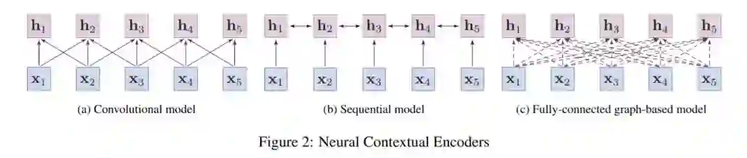 大部分的神经上下文编码器可以分为三类:卷积模型、序列模型和基于图的模型。图2说明了这些模型的体系结构。