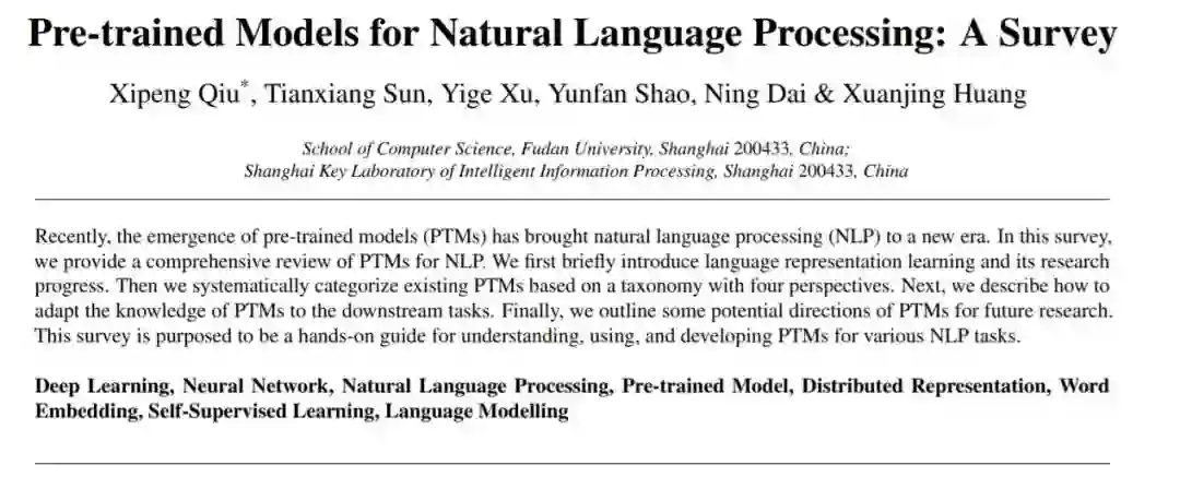 近年来,预训练模型(PTMs)的出现将自然语言处理(NLP)带入了一个新的时代。在这项综述中,我们提供了一个全面的PTMs调研。首先简要介绍了语言表示学习及其研究进展。然后,我们根据四种观点对现有的PTMs进行了系统的分类。接下来,我们将描述如何将PTMs的知识应用于下游任务。最后,我们概述了未来PTMs研究的一些潜在方向。本调查旨在为理解、使用和开发各种NLP任务的PTMs提供实际指导。