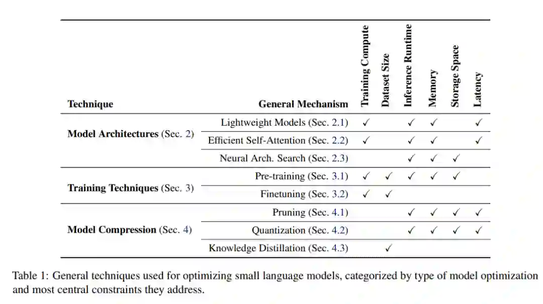 本综述分为三个主要部分,每个部分都涵盖了优化小型语言模型的关键方面。第2节关注模型架构,包括轻量化设计、高效的自注意力近似以及神经架构搜索以高效构建更小的模型。第3节涵盖高效的预训练和微调技术,以在资源受限的情况下提升小型语言模型的性能。第4节探讨了模型压缩技术,如剪枝、量化和知识蒸馏,它们可以在不显著牺牲精度的情况下减少模型的大小和延迟。第5节提供了基准数据集和评估指标的概述,提供了评估这些方法有效性的综合框架。第6节讨论了小型语言模型所启用的应用,按照约束条件进行分类。最后,第7节提出了针对小型语言模型的开放性挑战讨论。