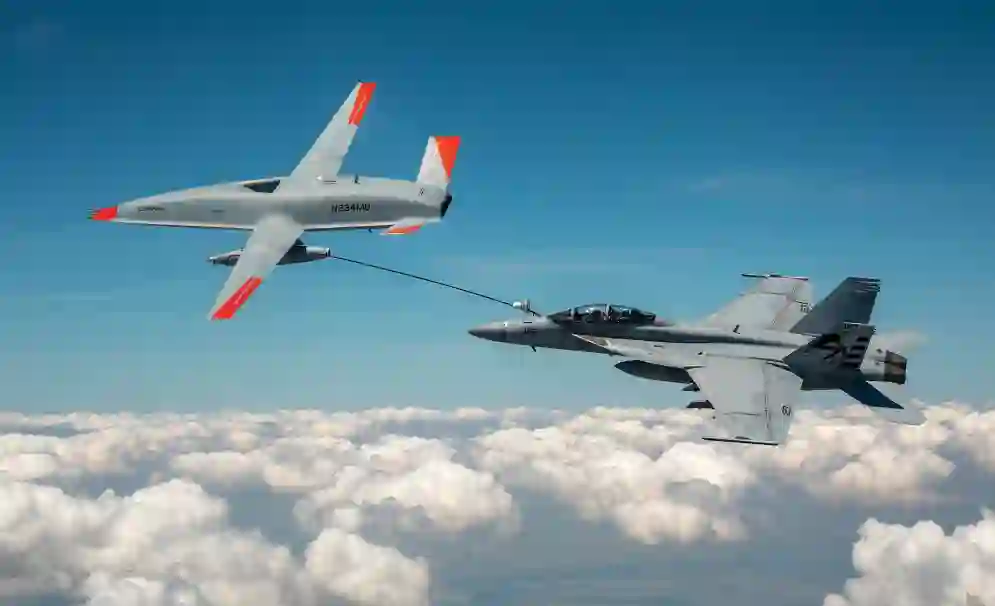 图:2021 年 6 月 4 日,在伊利诺伊州马斯库塔的中美洲机场附近,一架无人驾驶的波音 MQ-25 T1 黄貂鱼测试飞机(左)为有人驾驶的 F/A-18 超级大黄蜂加油。 (美国海军照片由波音公司提供)