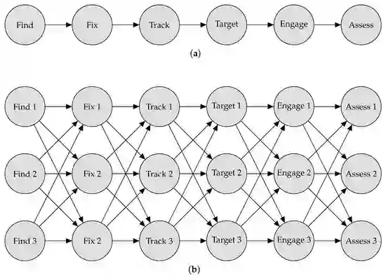 军事杀伤链是为成功完成一项任务而必须发生的一系列事件、任务或功能的序列。杀伤链的一个传统例子是成功使用武器对抗目标,但杀伤链可用于任何结果基于一系列事件序列的任务,例如,从信息系统外泄信息的网络攻击,或从空中侦察任务成功收集信息。“杀伤链”这一术语意味着这是一个必须完成的线性事件序列。然而,美国国防部正朝联合全域指挥控制迈进,这将需要协调多个具备数据与信息共享能力的网络化资产[1]。这一复杂的系统之系统将要求杀伤链演变为拥有多条路径以完成任务的“杀伤网”[2]。图1展示了一个常见杀伤链的例子,即“发现-锁定-跟踪-瞄准-交战-评估”模型[3,4],以及一个具有多条路径的杀伤网。使问题进一步复杂化的是人工智能融入杀伤网,其可能具备使用概率模型进行自主决策的能力[5]。对杀伤网进行分析和优化决策将需要数学模型。然而,在转向更复杂的杀伤网之前,需要先发展杀伤链的数学模型。