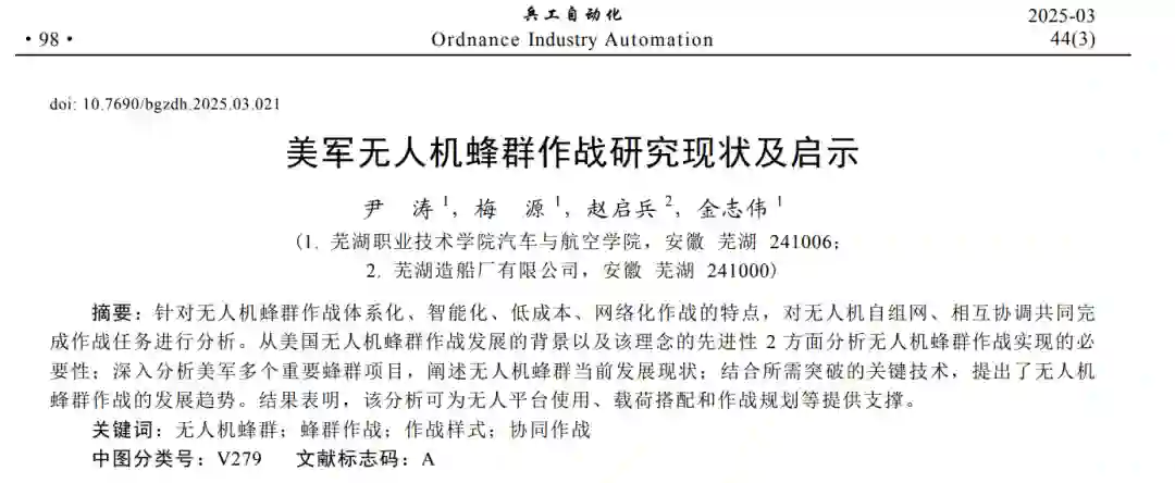 针对无人机蜂群作战体系化、智能化、低成本、网络化作战的特点,对无人机自组网、相互协调共同完 成作战任务进行分析。从美国无人机蜂群作战发展的背景以及该理念的先进性 2 方面分析无人机蜂群作战实现的必 要性;深入分析美军多个重要蜂群项目,阐述无人机蜂群当前发展现状;结合所需突破的关键技术,提出了无人机 蜂群作战的发展趋势。结果表明,该分析可为无人平台使用、载荷搭配和作战规划等提供支撑。