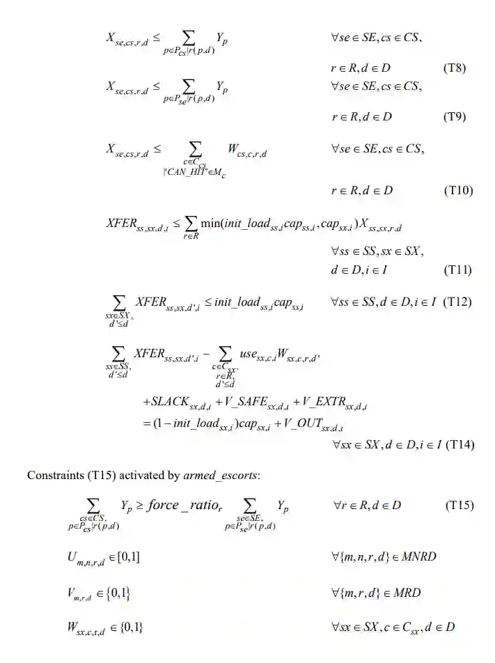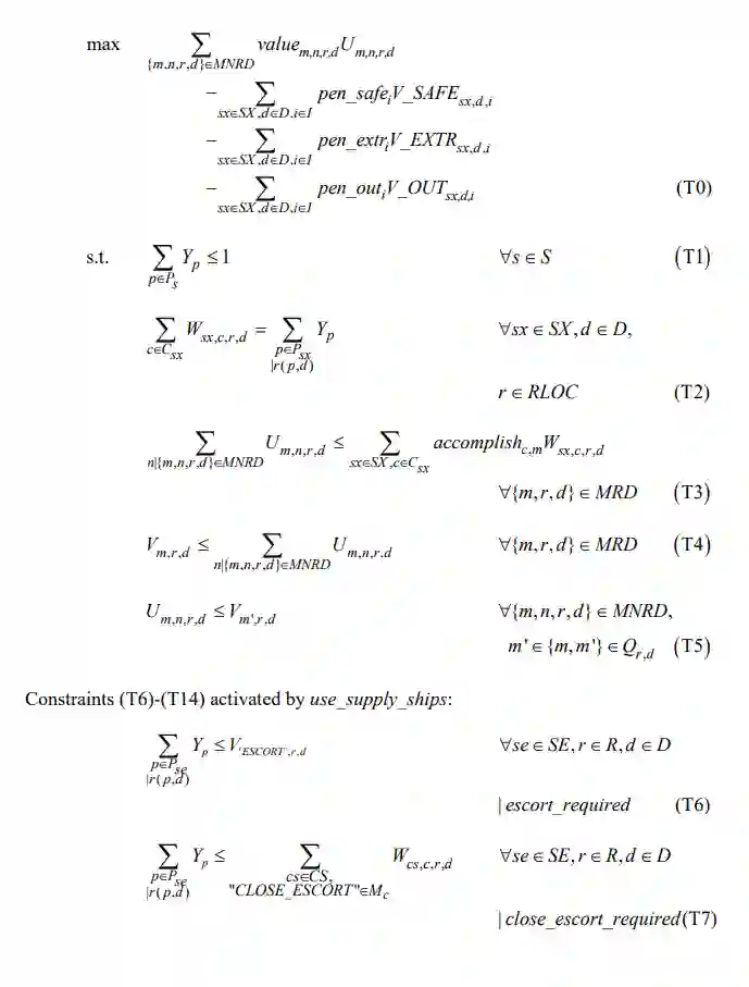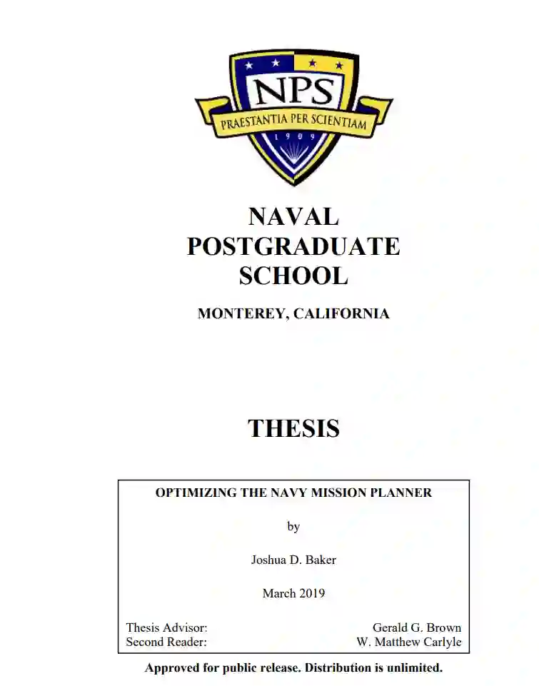 海军任务规划器(NMP)是一种基于优化的作战计划工具,适用于设计海军部署的各级决策者,从战区级计划到单个航母打击群(CSG)或驱逐舰中队(DESRON)。调度人员的任务过多,却没有足够的舰艇来完成这些任务。该辅助决策系统采用多任务能力舰艇,在给定的规划范围内将其分配到任务中,目标是最大限度地提高完成任务的总价值,同时考虑到任务集的地理位置以及舰艇的能力和局限性。以前的版本使用获得许可的商业软件和求解器进行优化,并对可供选择的舰艇部署进行有限的列举。本论文的重点是通过使用开源软件和求解器,使所有海军人员都能使用海军任务规划器。此外,它还在优化过程中提供了持久性,允许调度人员在规划期限内重新配置计划,并将对之前公布的计划的改动降到最低。我们还开发了两种部署规划方法,即随机路径枚举和网络流表述,这两种方法都提高了海军任务规划器的任务完成水平。此外,我们还创建了一个 "兵力比护航"参数,允许非作战舰艇在多艘具备防御能力的舰艇护航下通过危险区域。