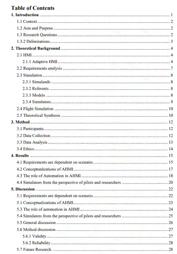 本研究的目的是分析文献中有关 AHMI 和需求工程等方面的理论信息。稍后将进行访谈。这项研究将通过科学家、试飞员和项目中其他人员提供的信息,为需求提供依据。这样做是为了进行专题分析,我们将在专题中找到感兴趣的关键点。根据专题分析的结果,我们将把自动人机交互的概念化和需求放在一个示范环境中,在这个环境中可以测试和评估新颖的自动人机交互概念。