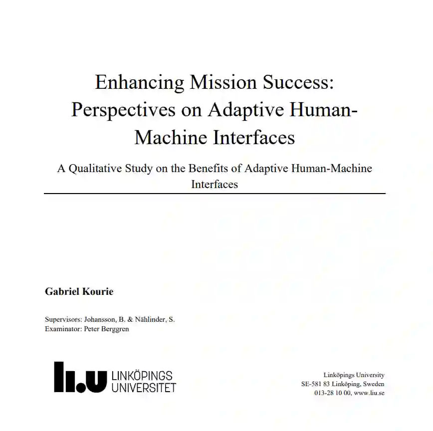 作为瑞典战斗机工业萨博航空项目的一部分,进行了这项研究。战斗机飞行员在敌区空域和空战的复杂环境中冒险时承受着巨大的压力。人机交互(HMI)是飞行员和飞机的共同点,它能使任务取得成功,但也有其局限性。自适应人机交互(AHMI)是一种经过改进的人机交互,可以在飞行员所处的环境中为其提供帮助。自适应人机交互有许多任务,但它的优势在于能够适应不同的情况,并为飞行员的健康提供帮助。这可以通过信息的适当可视化来实现,也可以通过较少任务的自动化来实现。任务的成功取决于生理参数,如心理工作量和态势感知,以达到最佳的操作性能。在这篇论文中,我们深入探讨了 AHMI 的重要性以及制作和演示 AHMI 所需的要求。将要求映射到模拟器上是推进人工生命监测仪开发的一个重要方面。为了进一步了解该领域并回答研究问题,我们进行了文献综述和访谈。受访者一致认为,映射需求的正确方法取决于需要研究的内容。是图形组件、原理、功能还是场景?通过文献对比和访谈主题分析,我们发现需求映射取决于要调查的内容。此外,AHMI 被认为是试点的有效支持系统,自主性在一定程度上是有效的。但是,当自主控制权过大时,飞行员就会失去对态势的感知能力,从而导致性能下降。在该项目中,受访者一致认为 AHMI 是推进战斗机驾驶舱发展的必由之路。