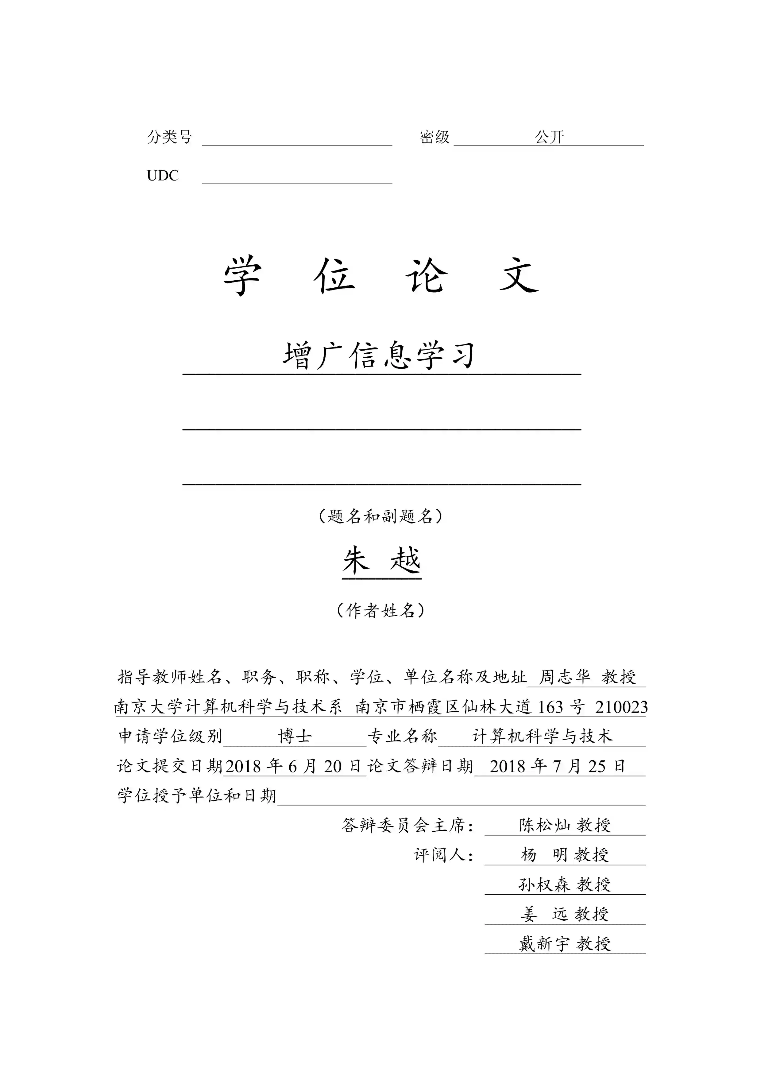 论文摘要:传统监督学习通常假设训练数据类别标记恒定、特征信息充分、样本充 足。但很多现实的机器学习任务不满足这些假设条件,导致学习效果不尽人 意。为此,本文考虑通过引入增广信息 (Augmented Information) 进行学习。增 广信息包括传统静态学习中未考虑的额外信息以及动态学习过程中出现的新信 息。本文主要工作如下: