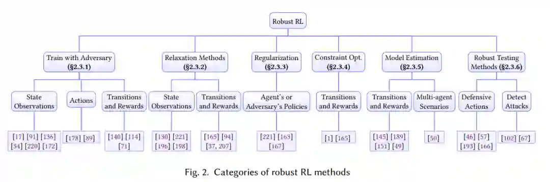 鲁棒强化学习旨在确定性地或统计地提高算法在面对不确定性和对抗性攻击时的最差性能。训练任务和测试任务之间的差异普遍存在。例如,在连续控制任务中,真实的物理参数可能与仿真中不同,而在自动驾驶场景中,周围的智能体可能具有新颖的驾驶行为。这种差异促进了鲁棒RL的发展。此外,现实世界应用程序的安全关键特性使得鲁棒性成为帮助避免灾难性故障的重要特性。研究RL中有效的攻击和防御的兴趣激增。这两个领域的详细综述可在[28,76,121]中找到。在本节中,我们首先从不同MDP组件(包括观察/状态、操作、转换和奖励)对不确定性的鲁棒性方面总结第2.2节中的鲁棒性RL公式。然后,我们在第2.3节中提出了鲁棒训练和测试方法,以提高对每个组件的不确定性或人为设计的攻击的鲁棒性。我们在图2中总结了鲁棒RL方法。最后,我们在第2.4节中介绍了用于测试所提议的鲁棒RL算法的鲁棒性的应用程序和基准。