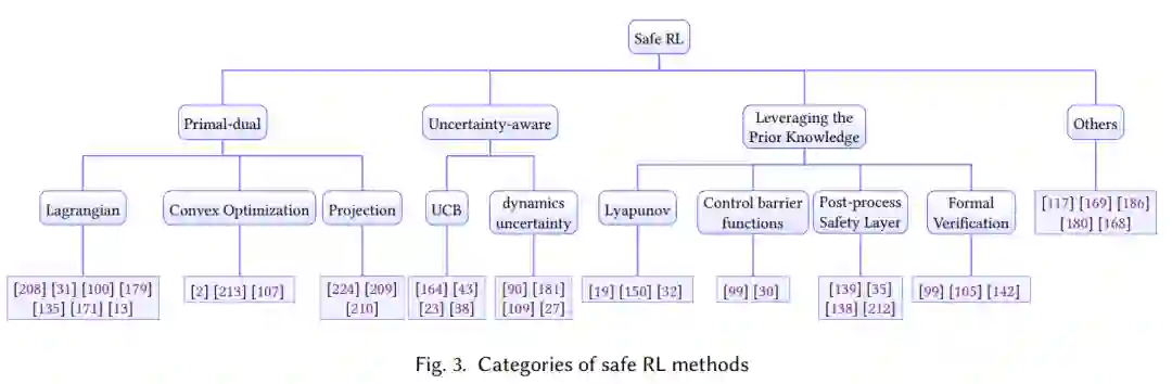 在将它们部署到现实世界的安全关键应用程序(如自动驾驶汽车)时,安全性也是另一个主要问题。传统的强化学习只关注从环境中获得的任务奖励最大化,缺乏满足安全约束的保证。安全的策略应该明确考虑训练期间的安全约束,并防止强化学习智能体造成破坏性成本或处于危险状态。例如,如果将RL算法部署在真实的机器人手臂上,安全约束将是避免碰撞脆弱的物体和周围的人,这可能会破坏宝贵的财产或造成伤害。类似地,自动驾驶应用中的RL智能体应该遵守交通规则,并避免与周围障碍物的碰撞。因此,为现实世界的应用开发安全的强化学习算法是很重要的,这些算法允许它们在满足一定的安全约束的情况下完成任务。安全强化学习又称约束强化学习,其目的是在满足安全约束条件的情况下,学习最大化预期任务奖励的策略。根据安全要求和训练要求,safe RL有不同的配方。在安全要求方面,有轨迹方面的安全约束和状态方面的安全约束。从训练需求的角度,我们可以将安全的RL分为两类:安全部署和安全探索,安全部署的目的是在模型训练结束后安全行动,但在训练过程中可能会违反约束;安全部署是指在训练过程中提供安全保障,使整个训练过程能够完成,而不会造成灾难性的不安全行为。注意在RL设置中,智能体需要从故障中学习,在安全RL设置中类似。有人可能会说,我们应该始终使用领域知识而不是主动学习来避免任何安全关键故障。然而,在这项调查中,我们发现在许多情况下,对环境风险的精确描述是不可用的。这也是我们既要注意安全部署,又要注意安全探索,管理风险的原因。